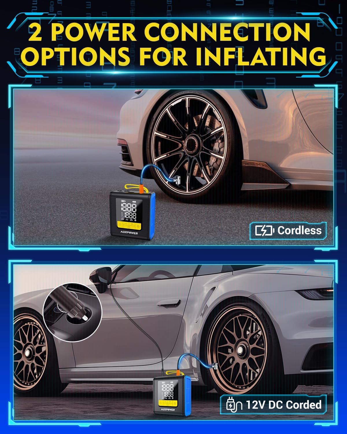 - ⚙️[4+N SMART PRESET MODES] Start intelligently with one click without complicated setup. Auxpower tire inflator portable air compressor offers 4 preset inflation modes ( car, motorcycle, bike, ball) and a manual custom modes to perfectly suit your unique needs.Smart preset modes make it easy to start inflating while you're on the go.