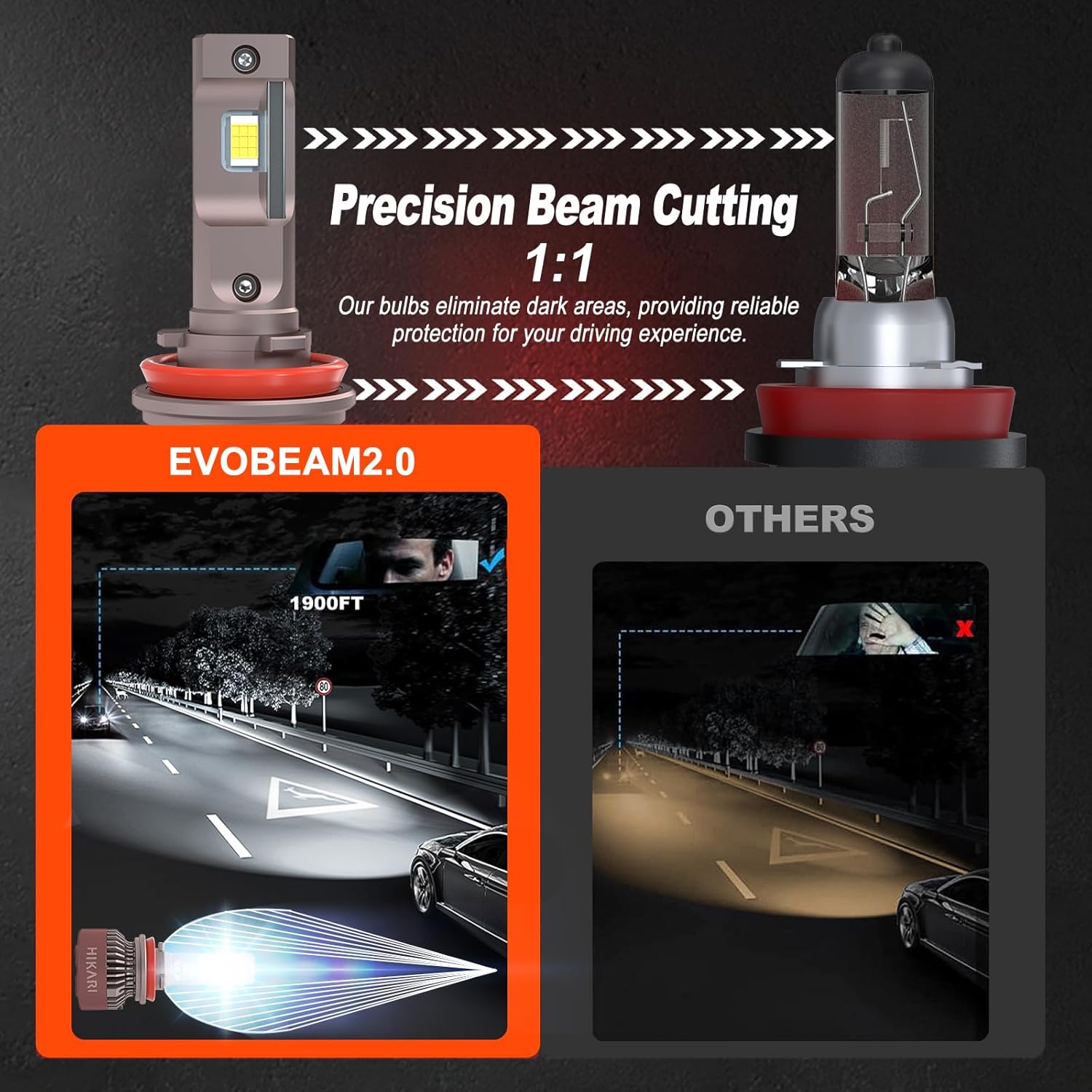 - 【Pure White & Extended Reach】: HIKARI Darkenex LED bulbs, featuring the advanced Evobeam2.0 chip, deliver 30,000 lumens of crisp 6000K light, illuminating up to 1800 feet ahead, making them suitable for use in rainy and foggy weather.