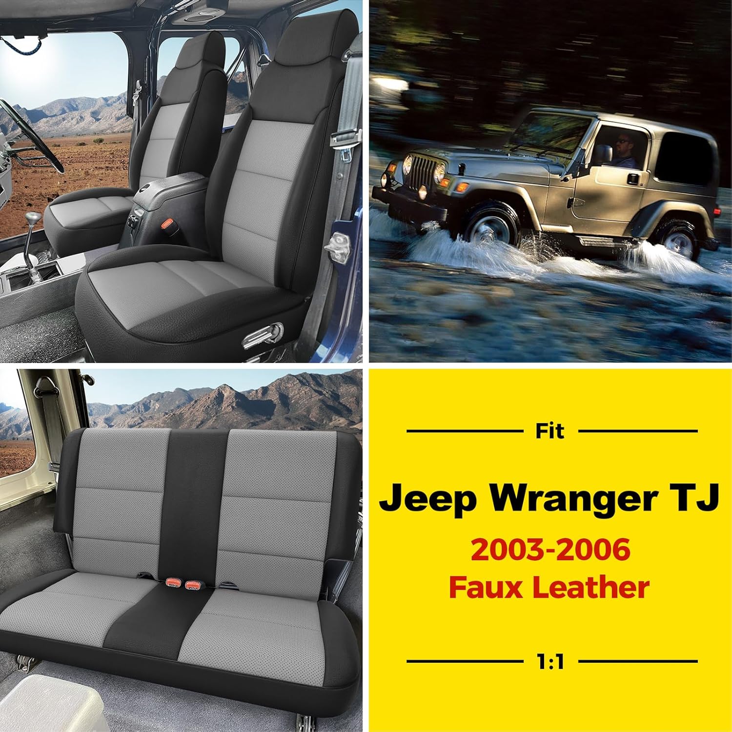 GIANT PANDA Full Set Car Seat Covers Customized Jeep Wrangler TJ Rubicon Sahara Sport X Unlimited 2003 2004 2005 2006, Faux Leather (Black&Gray)
