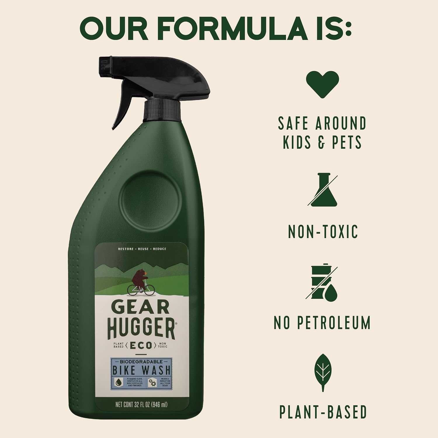 - POWERFUL BIODEGRADABLE FORMULA – Gear Hugger Bike Wash Soap is specially formulated as an eco-friendly solution, crafted with biodegradable ingredients like natural saponins and eucalyptus essential oil. This bike cleaner penetrates dirt, grime & grease without leaving harmful residues, making it a safe option for both the environment and bike enthusiasts who prioritize green products. Perfect for those looking to care for their bikes responsibly, providing a thorough clean without compromise.