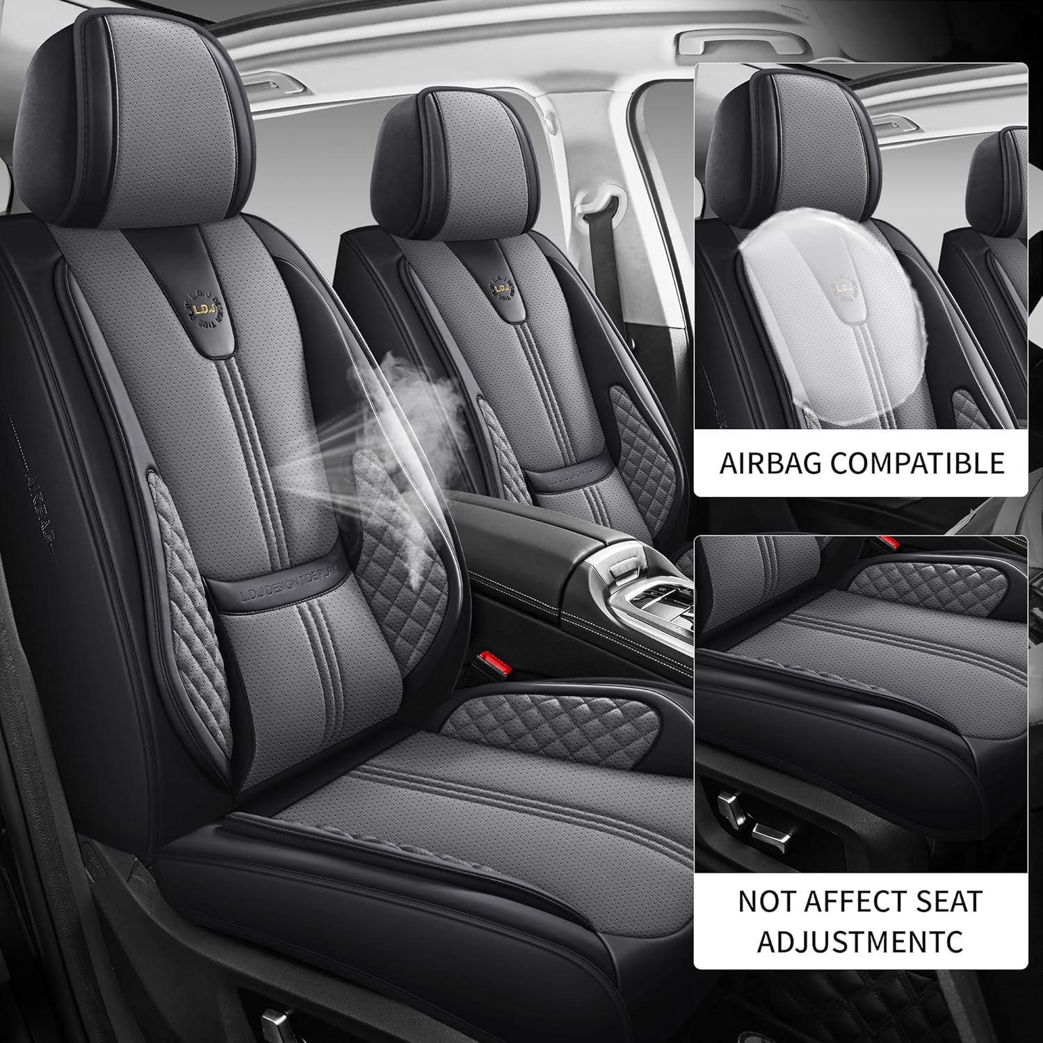 Car Seat Covers Full Set, Black Seat Cover for Cars Compatible Airbag, Easy Install Luxury Leather Automotive Seat Covers with Lumbar Support, for Car, Truck, SUV, Grey