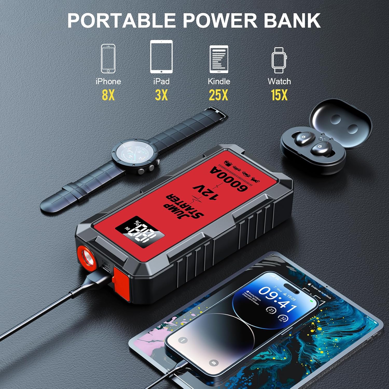 - ăPortable Charger and LED Flashlight ăThe Car Jump Starter Built-In Led Flashlightďź Provides Illumination In Low-Light Conditions Or Roadside Emergencies.Also Doubles As A Portable Power Bank To Charge Phones, Tablets, And Other Usb Devices On-The-Go.