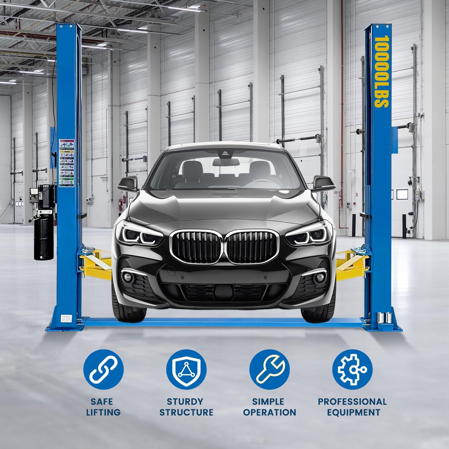 - Top hydraulic system, 110 V ; 10,000 lbs Capacity, Driven by dual hydraulic cylinders; Auto Car Lift is CE certified.Standardized for 115% dynamic load capacity and tested for 150% static load capacity
