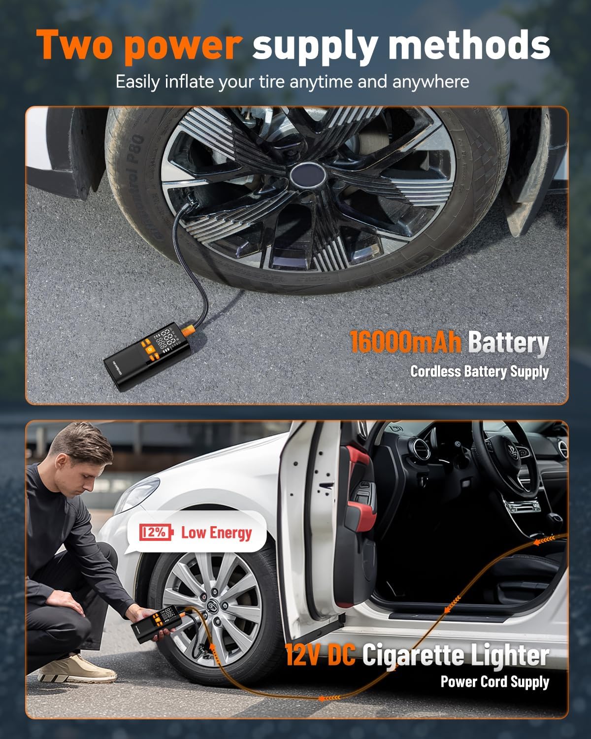 - 【16000mAh Long Battery + DC Backup】 Inflates up to 12 car tires on a full charge. The built-in rechargeable battery and 12V DC cable make this portable air compressor perfect for long trips, emergencies, or daily use—no outlet needed.