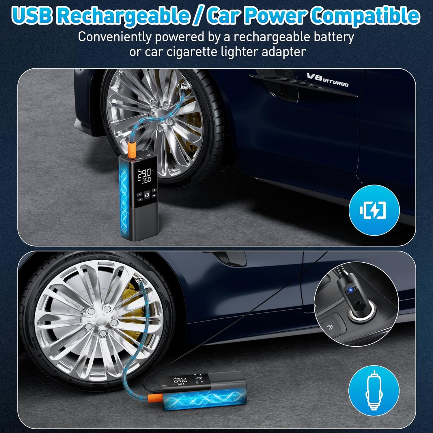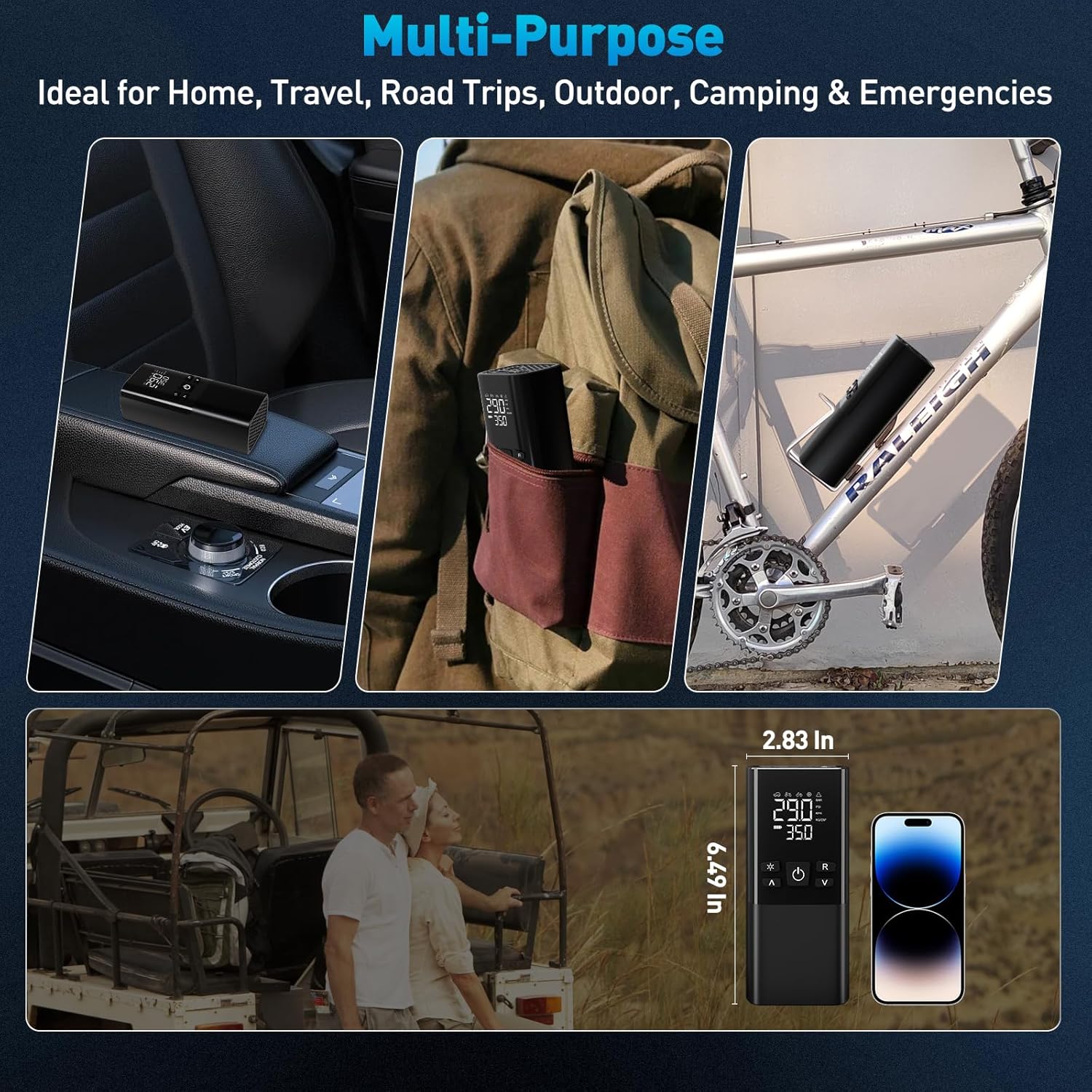 - 【Fast & Efficient Inflation】This high-power air compressor delivers rapid airflow to inflate car, motorcycle, and bike tires within 1 minutes. Whether at home or on the road, this portable tire inflator ensures quick and reliable inflation whenever needed.
