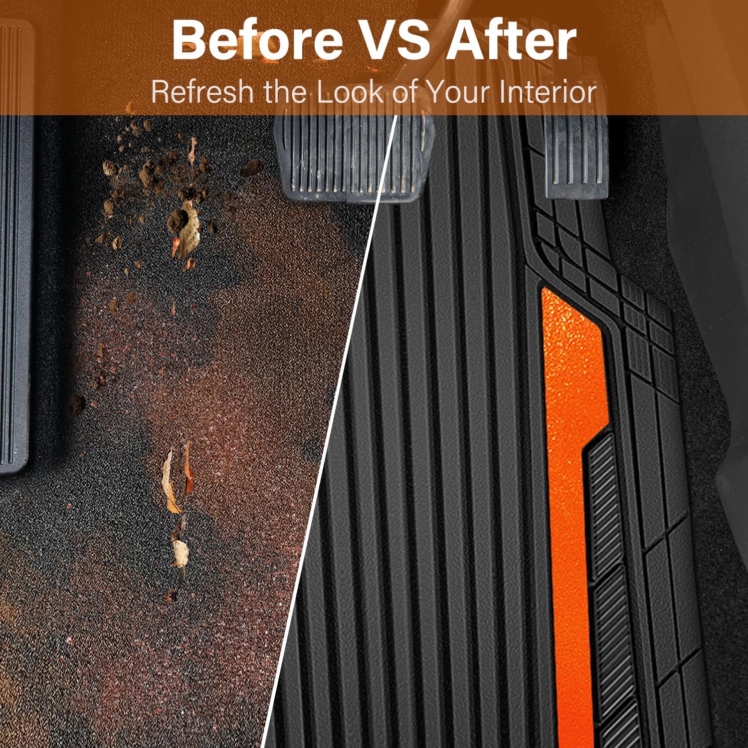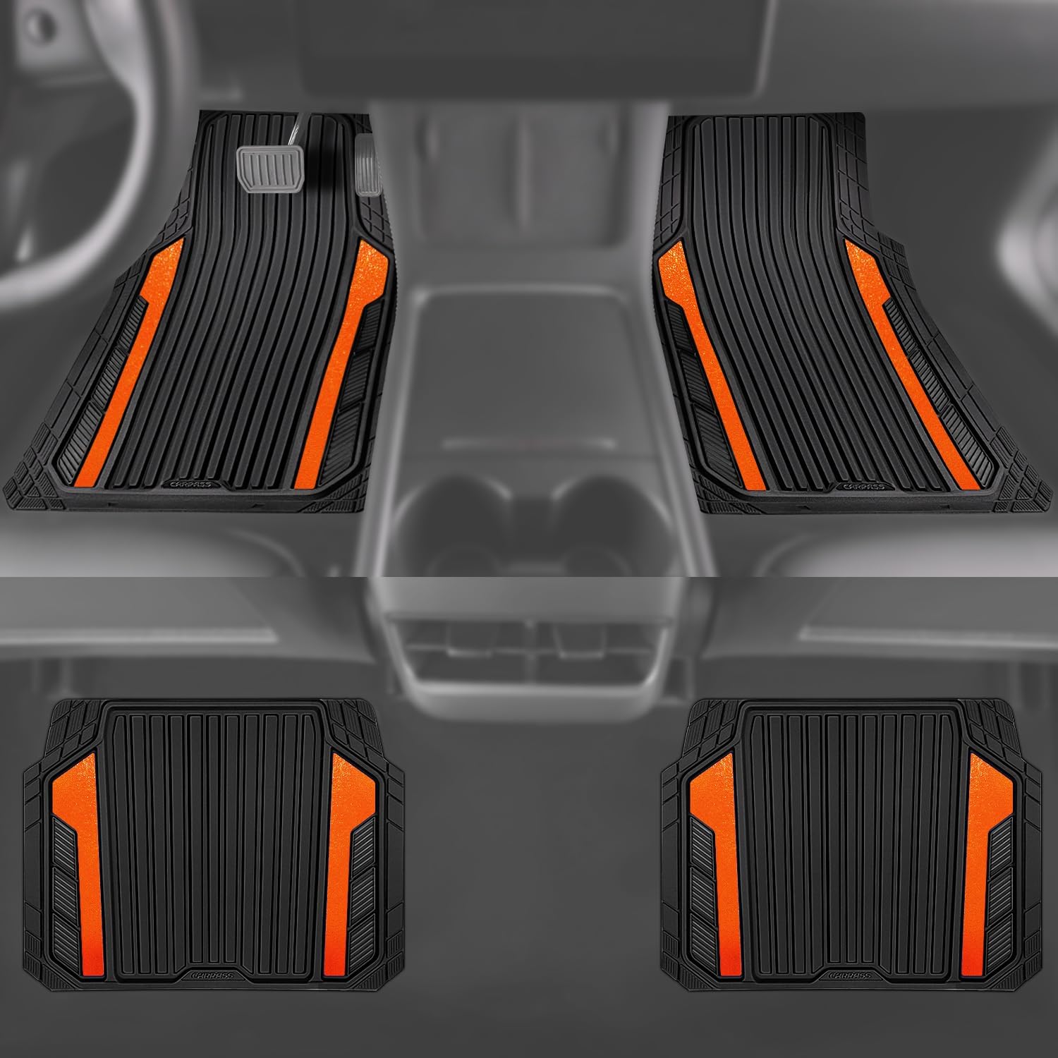 CAR PASS Heavy Duty Rubber Car Mats Metallic, Aluminum Film All Weather Floor Mats Waterproof Universal Trim to Fit SUVs Sedans Vans 4 Piece Anodized Deep Dish Two-Tone Sporty Black Orange Chrome