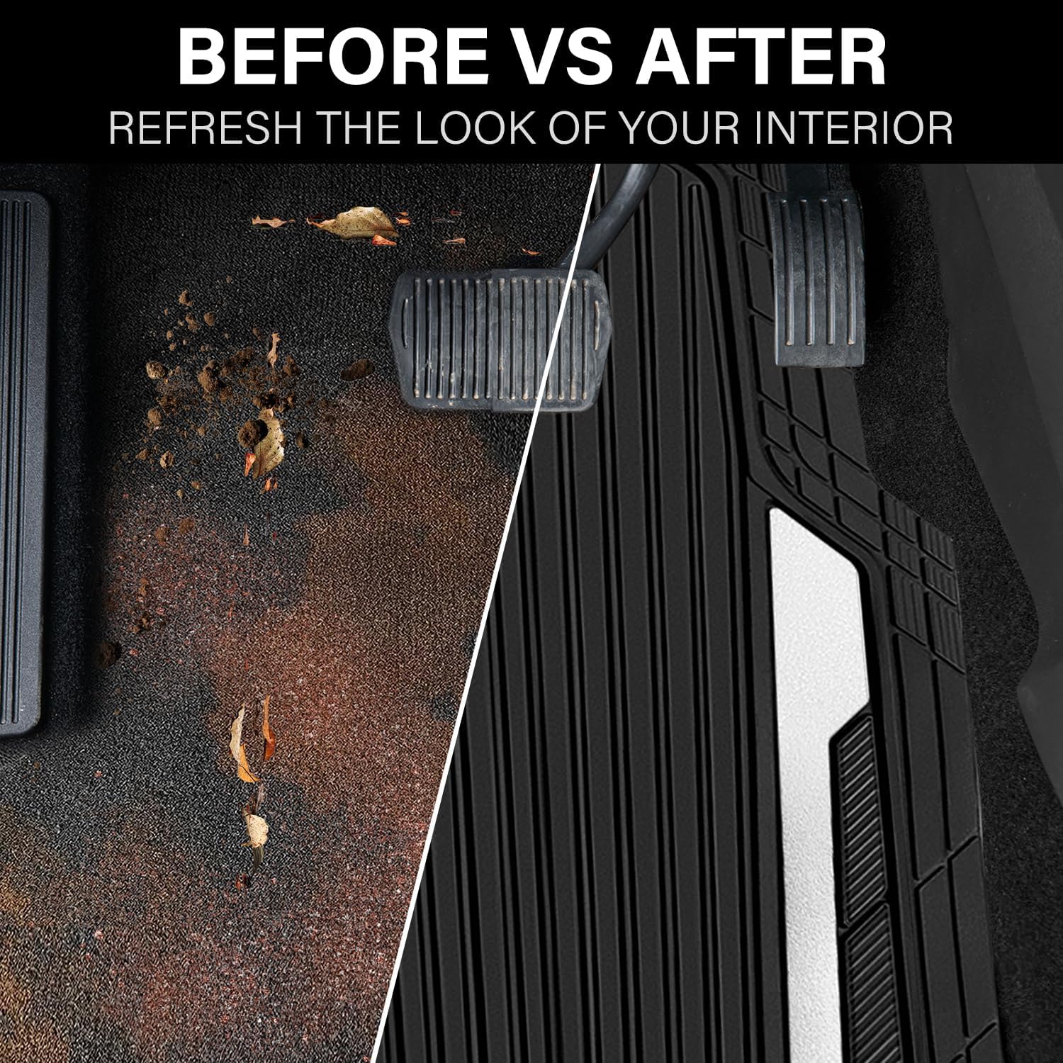 - ăPremium Rubber MaterialăThis anodized two tone all weather car floor mats are designed with premium quality rubber and aluminum film splicing, combining durability and fashion, providing your car with long-lasting protection and enhancing the aesthetics of your car.