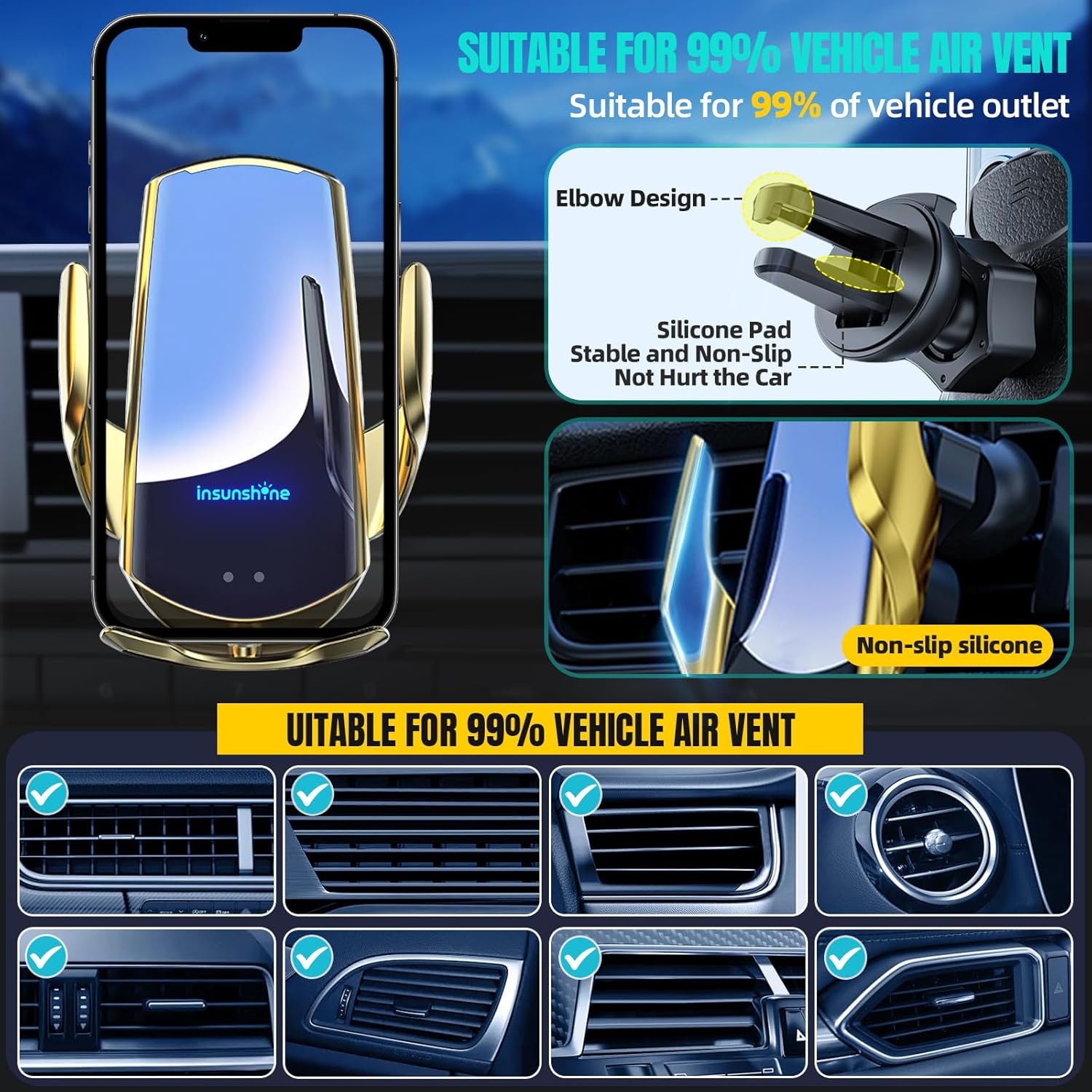 Wireless Car Charger, MAX 15W Fast Charging Auto Clamping, Sensing Phone Holder Mount, fit for iPhone 16 15 14 13 12 Pro Max Xs X, Samsung Galaxy S24 Ultra S23 S22 S21 S20 Note20 (5-Golden)
