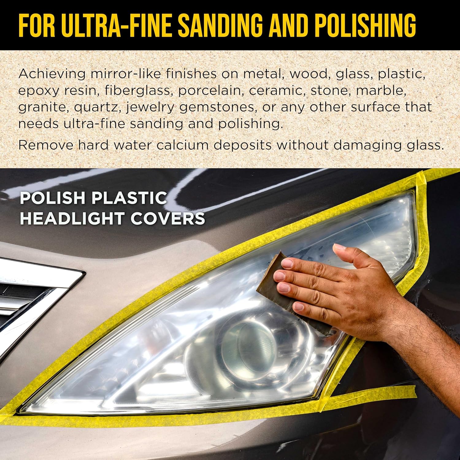 - These 10000-grit super-fine-cut waterproof sandpaper sheets are ideal for ultra-fine color sanding and polishing on auto paint finishes in autobody and detailing shops and for achieving mirror-like finishes on metal, wood, glass, plastic, epoxy resin, fiberglass, porcelain, ceramic, stone, marble, granite, quartz, jewelry gemstones, or any other surface that needs ultra-fine sanding and polishing. Remove hard water calcium deposits without damaging glass. Polish plastic headlight covers.