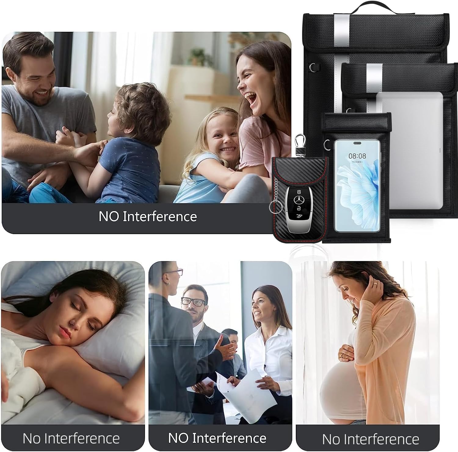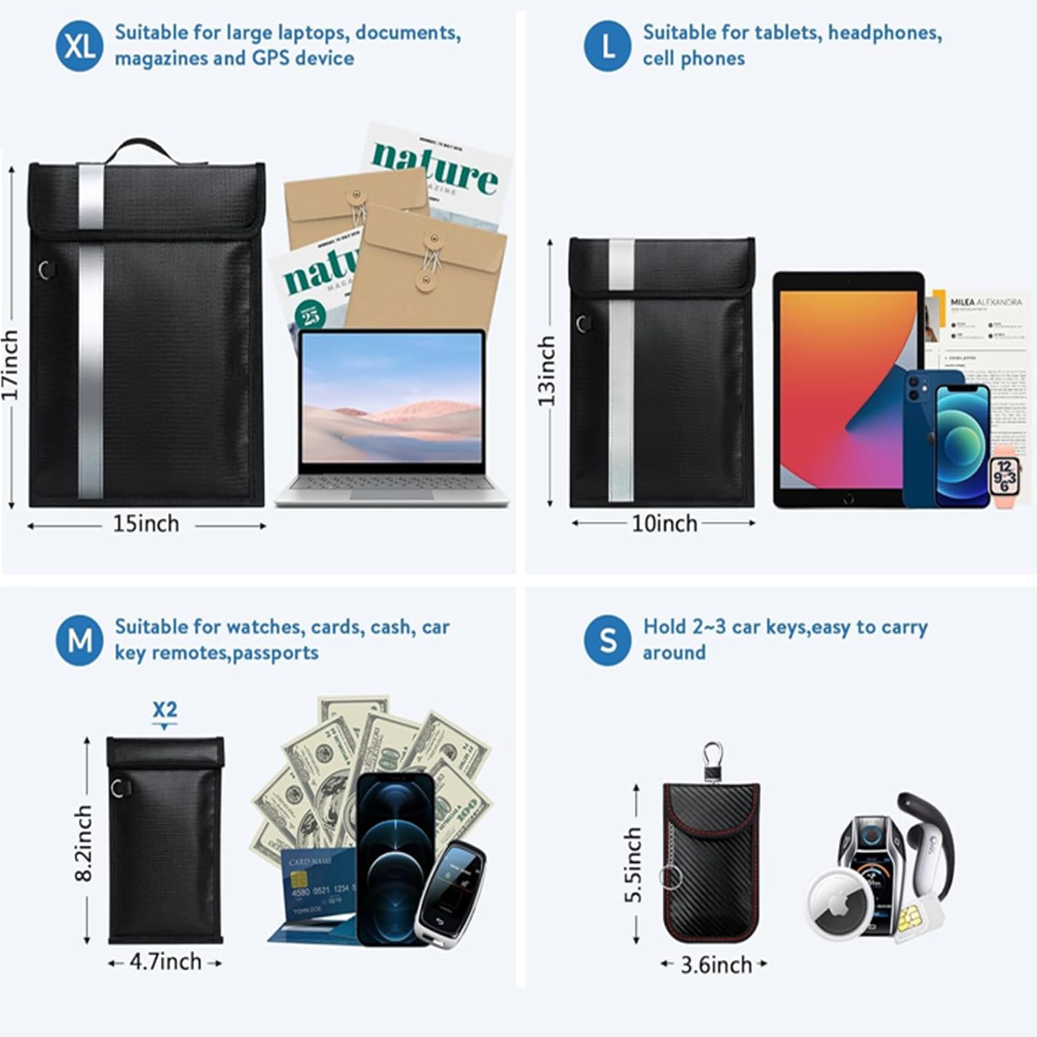 - 5 Pack Faraday Bags📶Different sizes for different devices: Extra-large (17in*15in) fits for large laptops, documents, magazines, GPS devices; Large Faraday bag (13in*10in) can hold tablets, cell phones, radios and other electronic devices; Two Medium-sized faraday bags for phones (8.2in*4.7in) can hold all sizes of cell phones on the market; A RFID car key bag (5.5in* 3.6in)