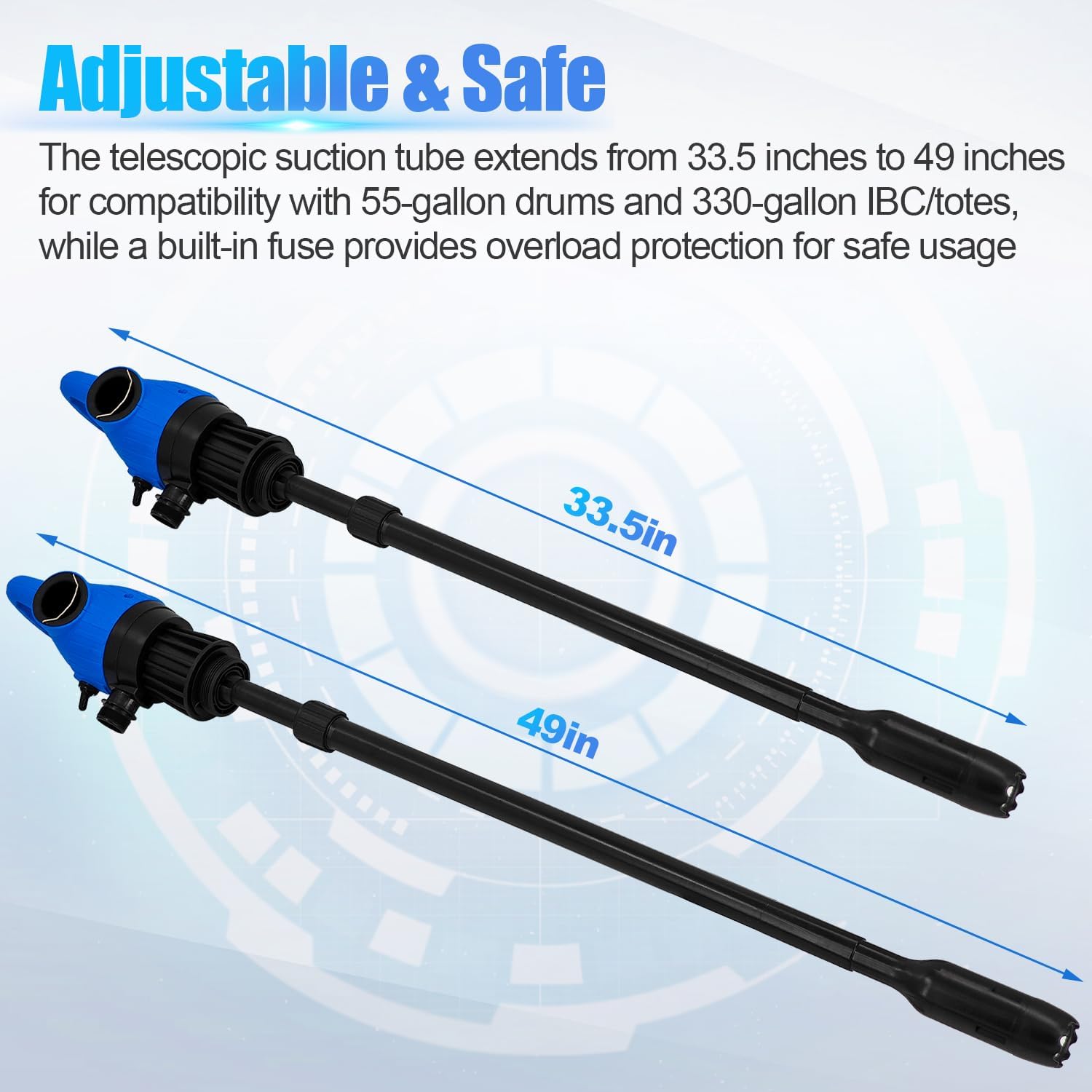 - [Adjustable & Safe]: The telescopic suction tube extends from 33.5 inches to 49 inches for compatibility with 55-gallon drums and 330-gallon IBC/totes, while a built-in fuse provides overload protection for safe usage