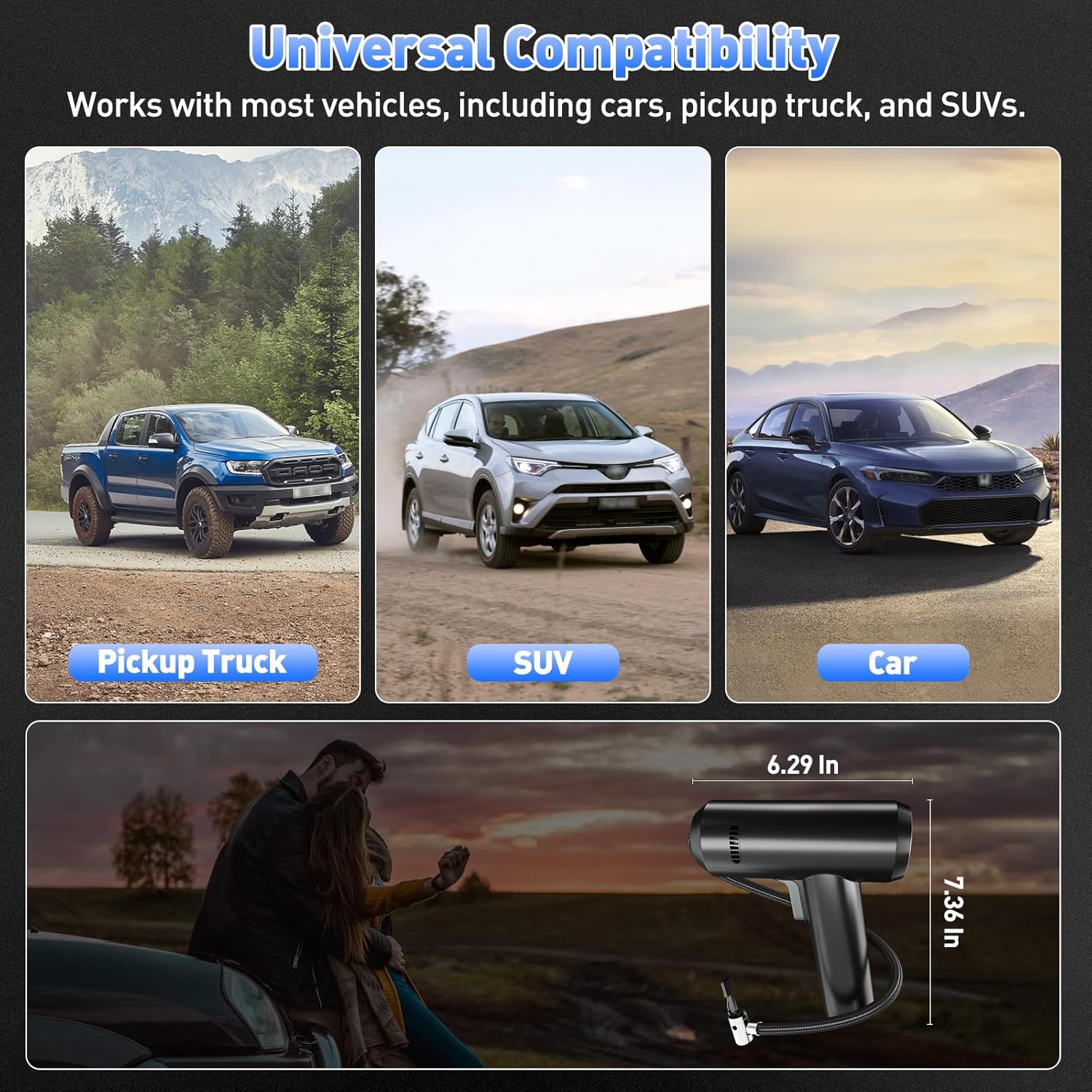 - 【Compact & Travel-Friendly】Designed for convenience, this lightweight and compact air compressor easily fits in your car trunk, glove box, or under the seat. Keep it handy for road trips, long drives, or unexpected tire emergencies. A must-have car accessory for any vehicle owner!