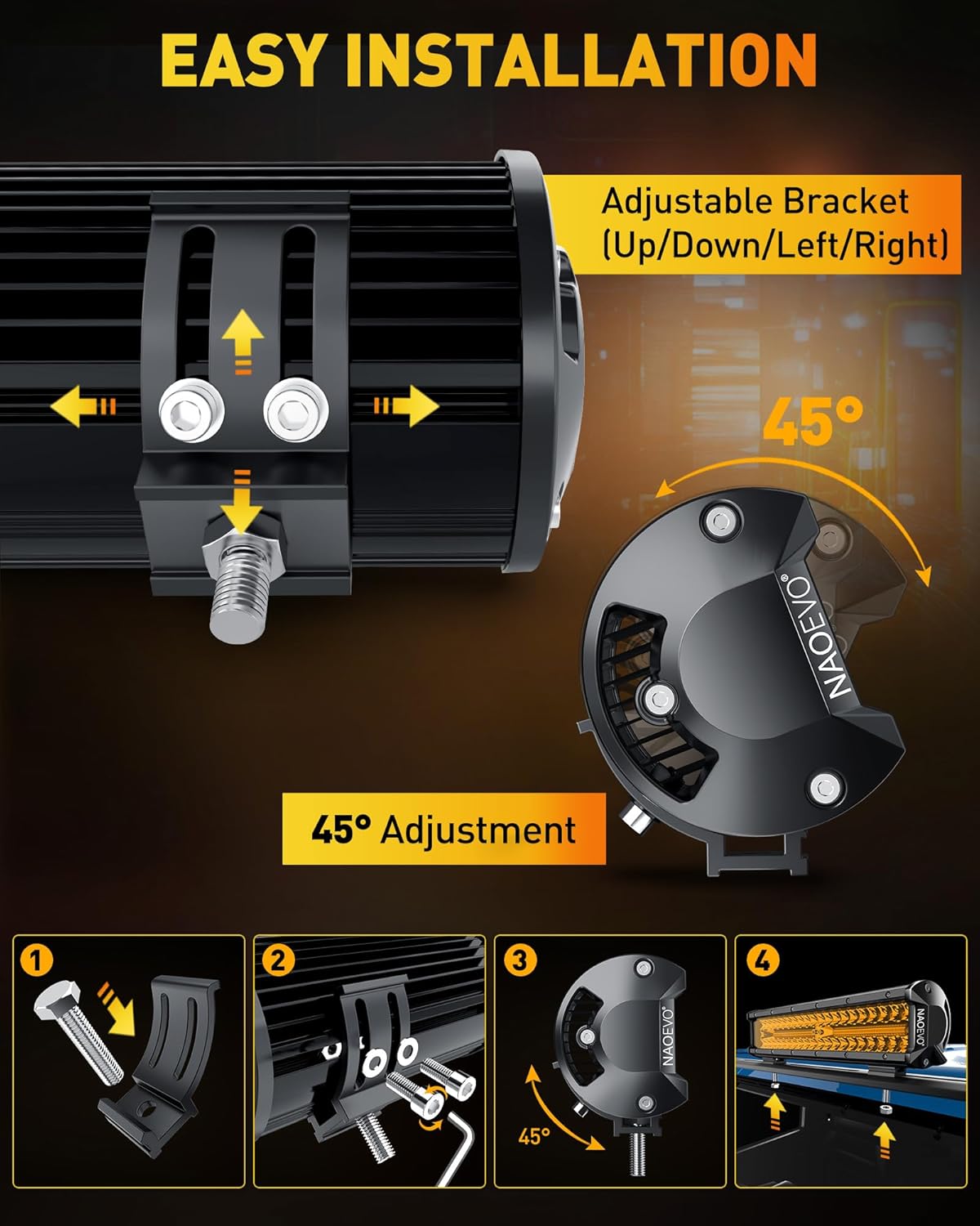 - [Ultra Bright LED Bar] - NAOEVO 12 inch light bar has a total of 100pcs high-quality SMD3030 led chips inside, achieving lighting effects of 300W/30000LM. Its bright and high penetration 3000K amber light easily defeats the darkness in front of you, helping you drive safely and efficiently!