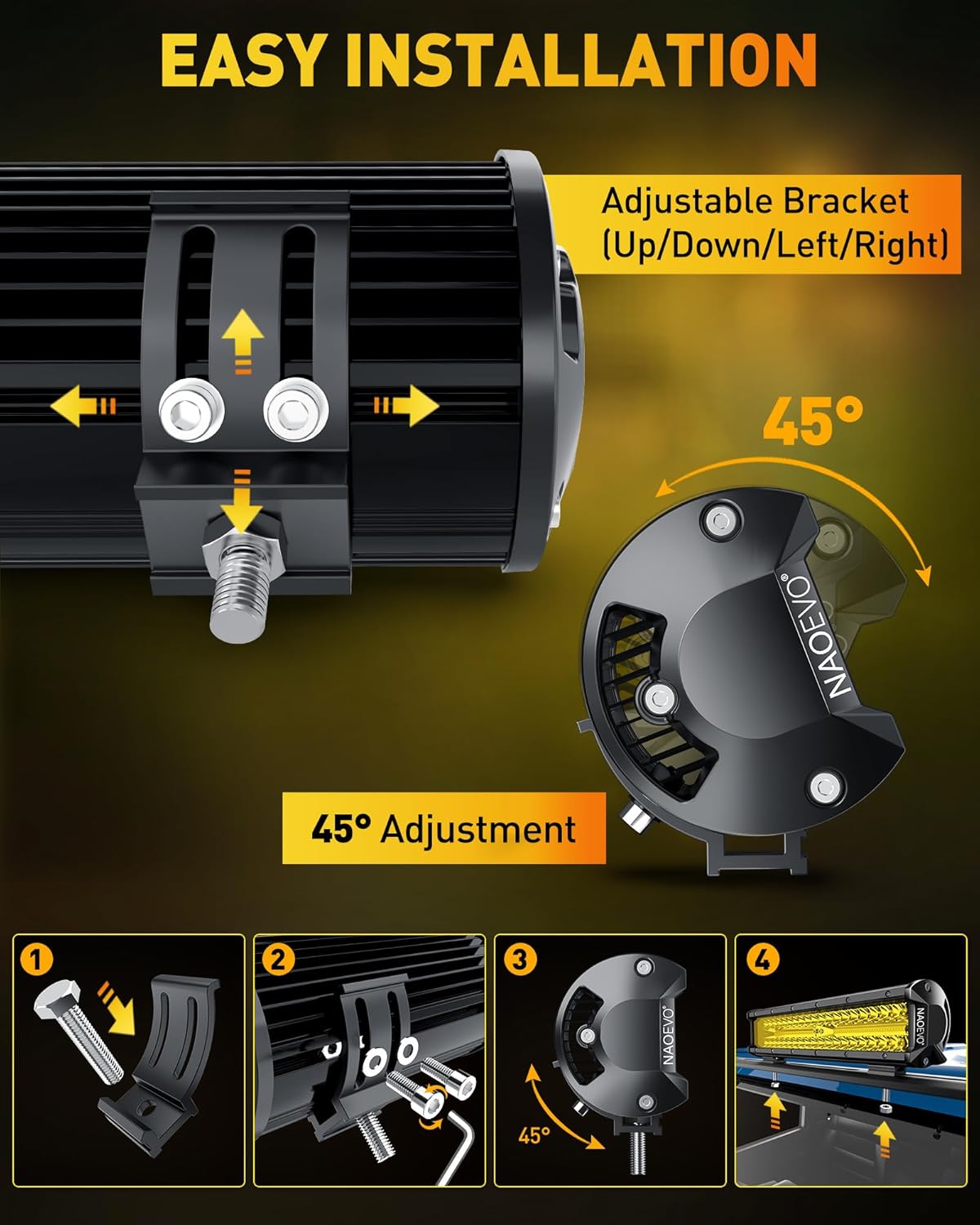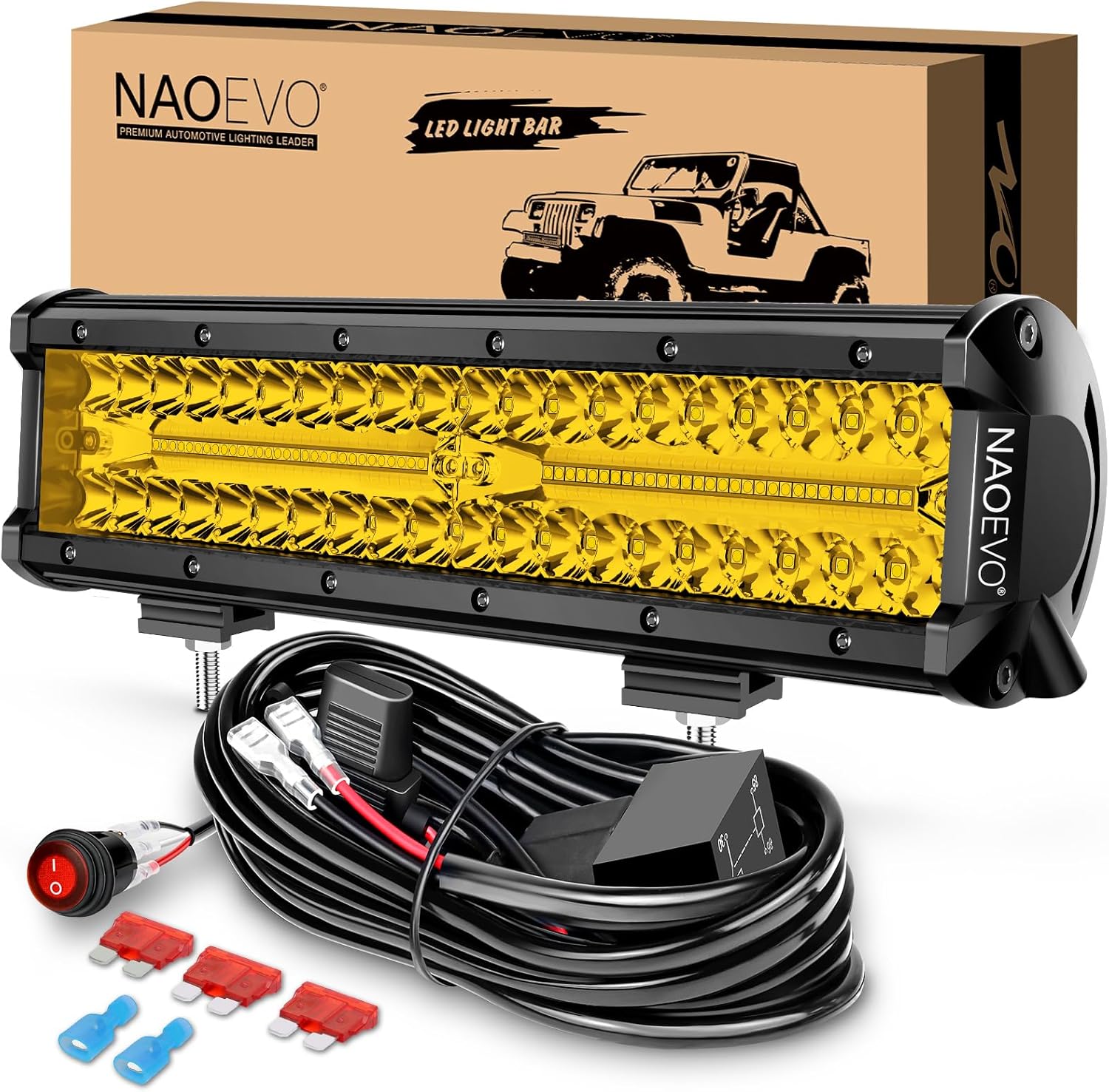 - [Ultra Bright LED Bar] - NAOEVO 12 inch light bar has a total of 100pcs high-quality SMD3030 led chips inside, achieving lighting effects of 300W/30000LM. Its bright and high penetration 3000K yellow light easily defeats the darkness in front of you, helping you drive safely and efficiently!