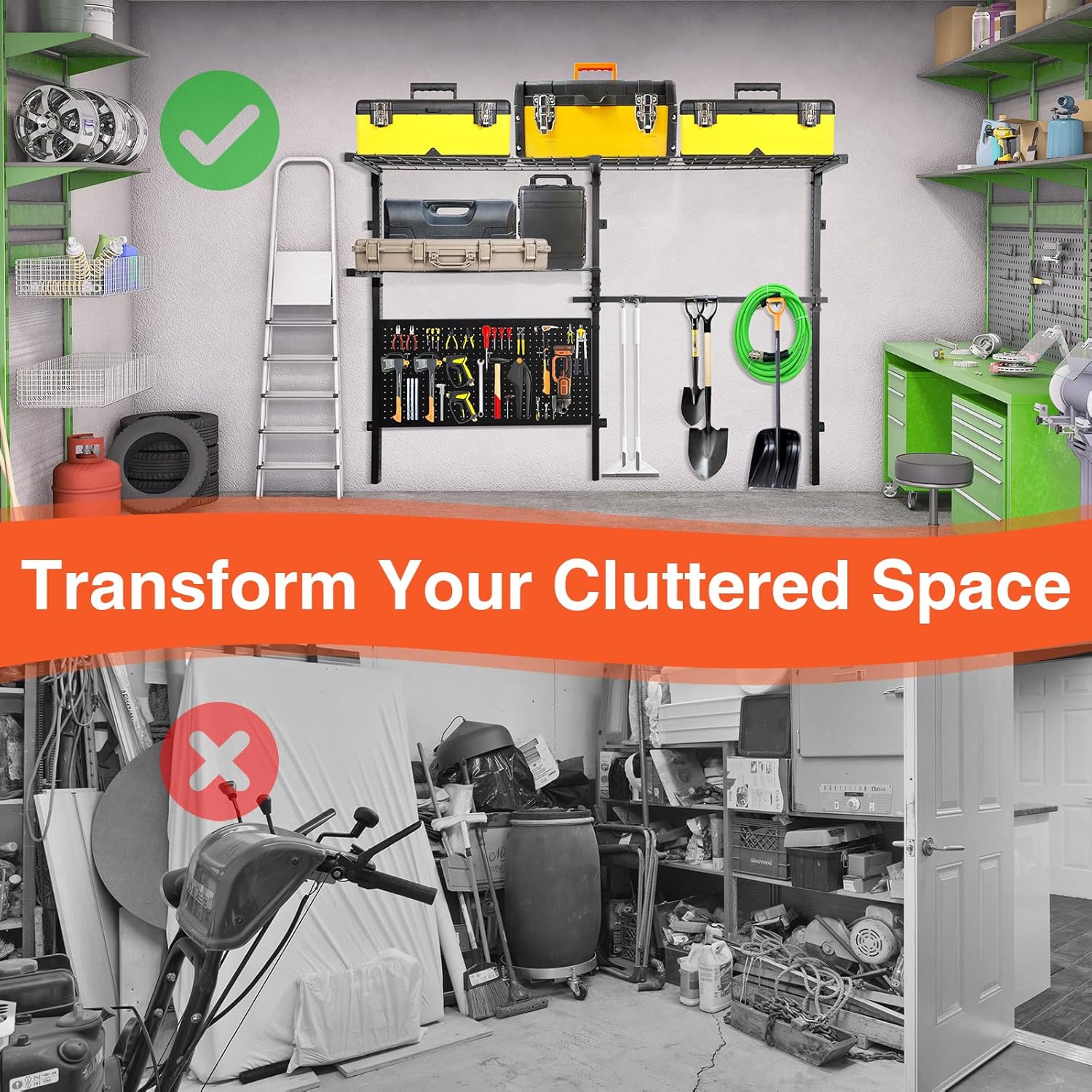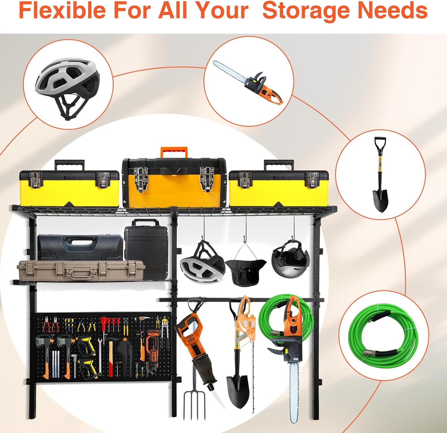 Garage Shelf Wall Mounted with Pegboard Heavy Duty Garage Wall Shelving with Garden Tool Rack and Hooks Garage Tool Organizer for Home Garden Yard Organization and Storage Holds 500lbs