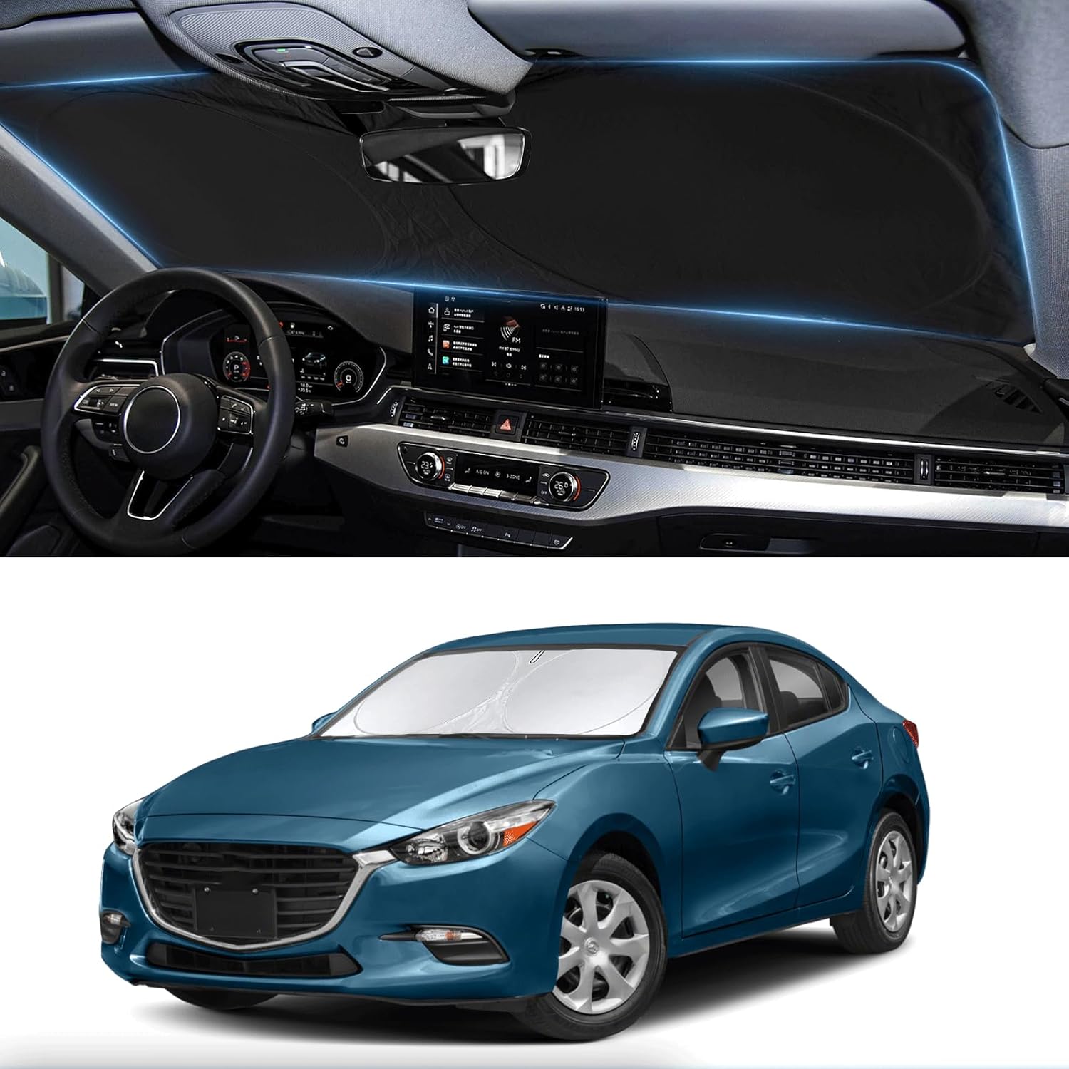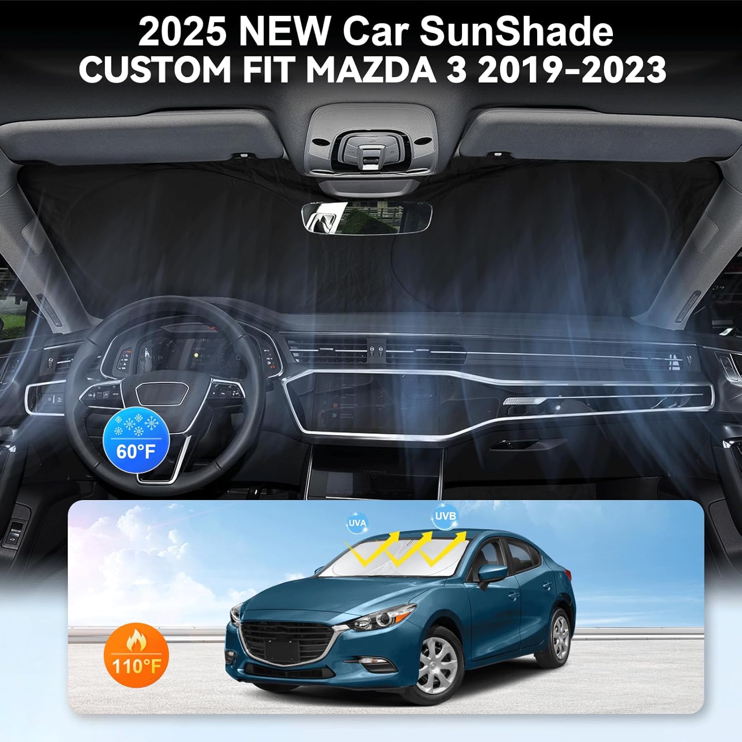 - [CUSTOM-FIT FRONT WINDSHIELD SUNSHADE] Automotive windshield sun shade is Specifically designed,which for Mazda 3 Accessories 2019-2023 2024 2025. We have several size of car sunshade. Please measure your car size and refer to our size before your purchase. Once installed it won't have gaps, sags or slumps like other car sun shade windshield