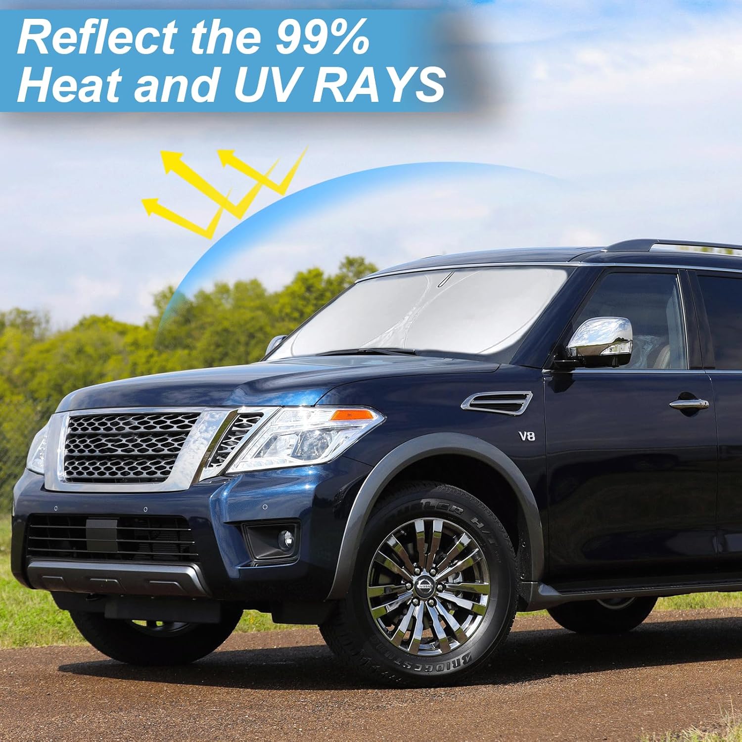 - [CUSTOM-FIT FRONT WINDSHIELD SUNSHADE] Automotive windshield sun shade is Specifically designed,which for 2017-2024 2025 Nissan Armada accessories. We have several size of car sunshade. Please measure your car size and refer to our size before your purchase. Once installed it won't have gaps, sags or slumps like other car sun shade windshield