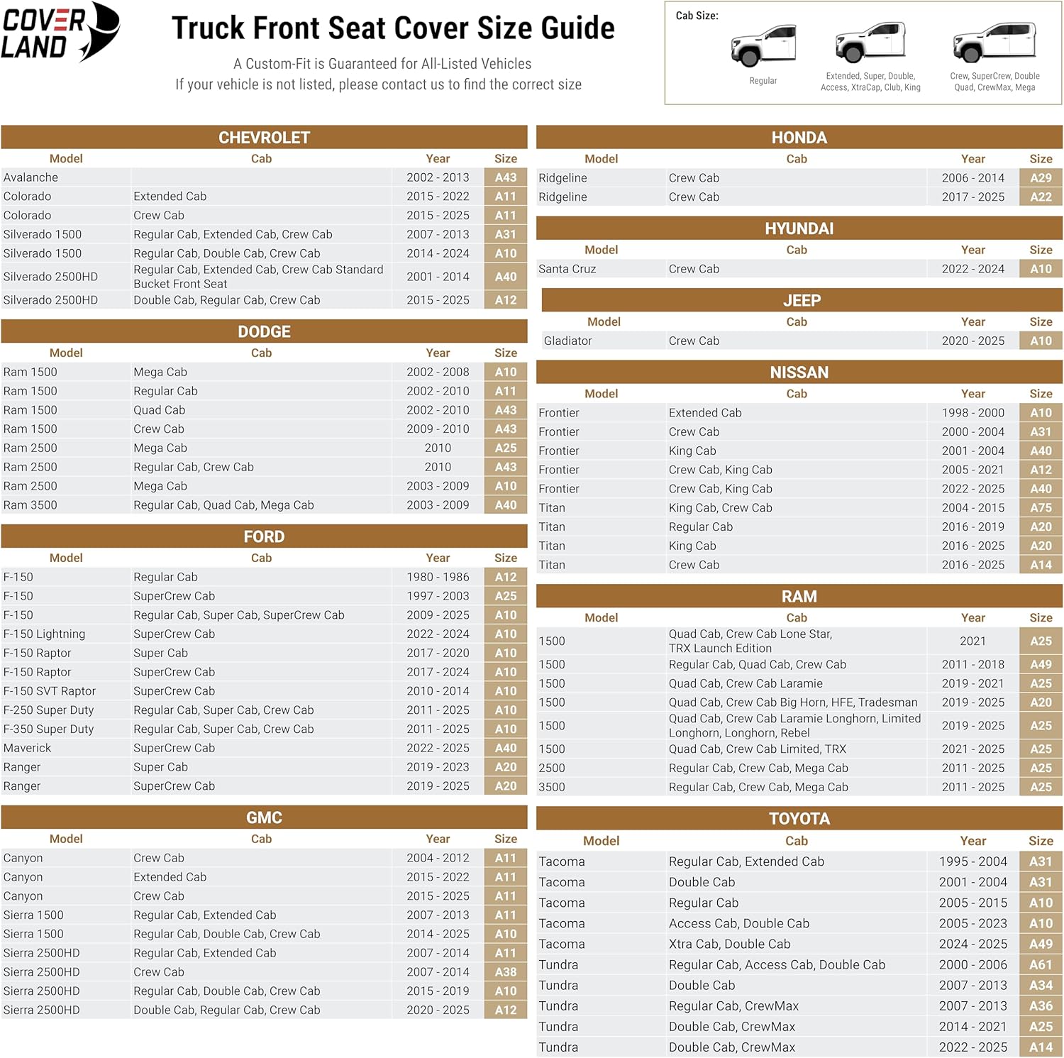 - CUSTOM FIT & ULTIMATE PROTECTION: Protect your 2001-2014 Silverado 2500HD Regular Cab, Extended Cab, Crew Cab, 2003-2009 Ram 3500 Regular Cab, Quad Cab, Mega Cab, 2022-2025 Maverick SuperCrew Cab, 2001-2004 Frontier King Cab, 2022-2025 Frontier Crew Cab, King Cab with our custom-fit seat covers. These covers are designed for full coverage and safeguard your seats from wear, tear, and stains.
