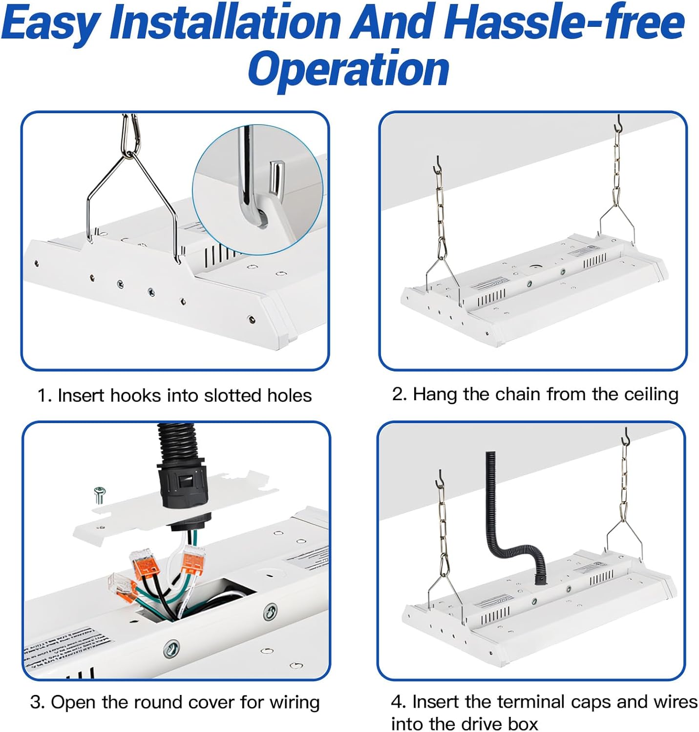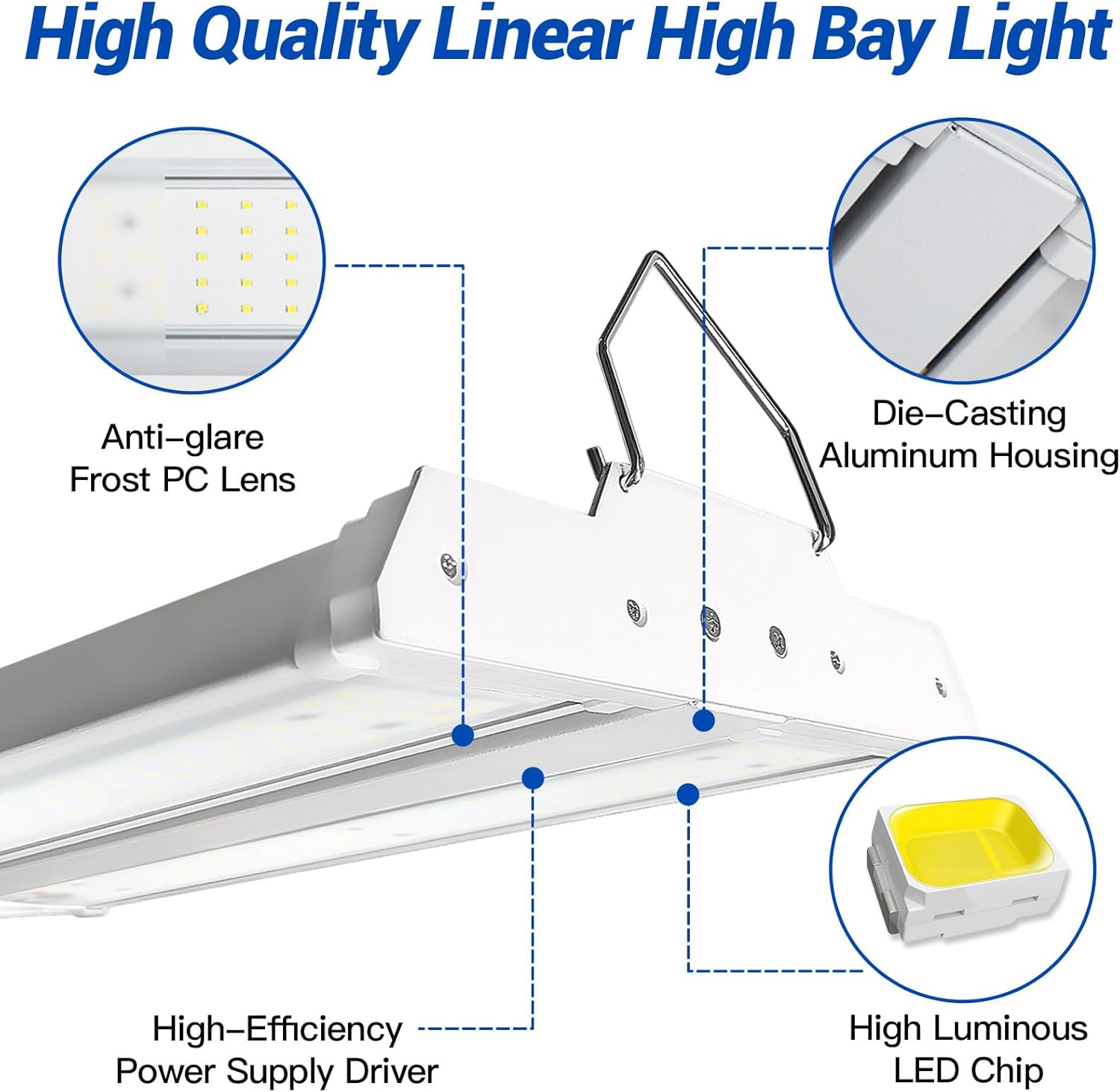 - 【Superb Heat Radiation】The linear highbay workshop light has a great heat dissipation design. Its anti-rust aviation aluminum housing has multiple heat dissipation holes. This design gives it remarkable heat dissipation capabilities, ensuring a 50,000-hour lifespan (8 hours daily use equals 17 years).