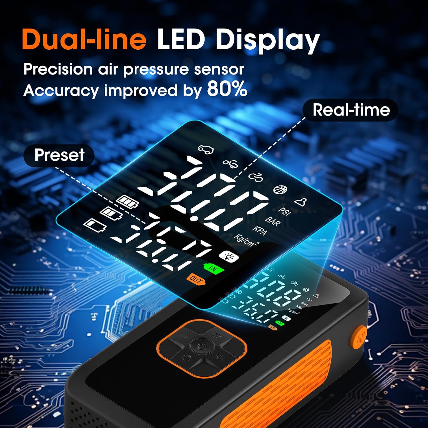 - 【Dual-Screen Pressure Gauge】Our portable tire inflator comes with a high-precision LCD dual-screen display, clearly showing both real-time tire pressure and preset pressure. The screen is easy to read even in bright conditions. The dual-screen design allows you to monitor the inflation process in real-time with exact tire pressure values.