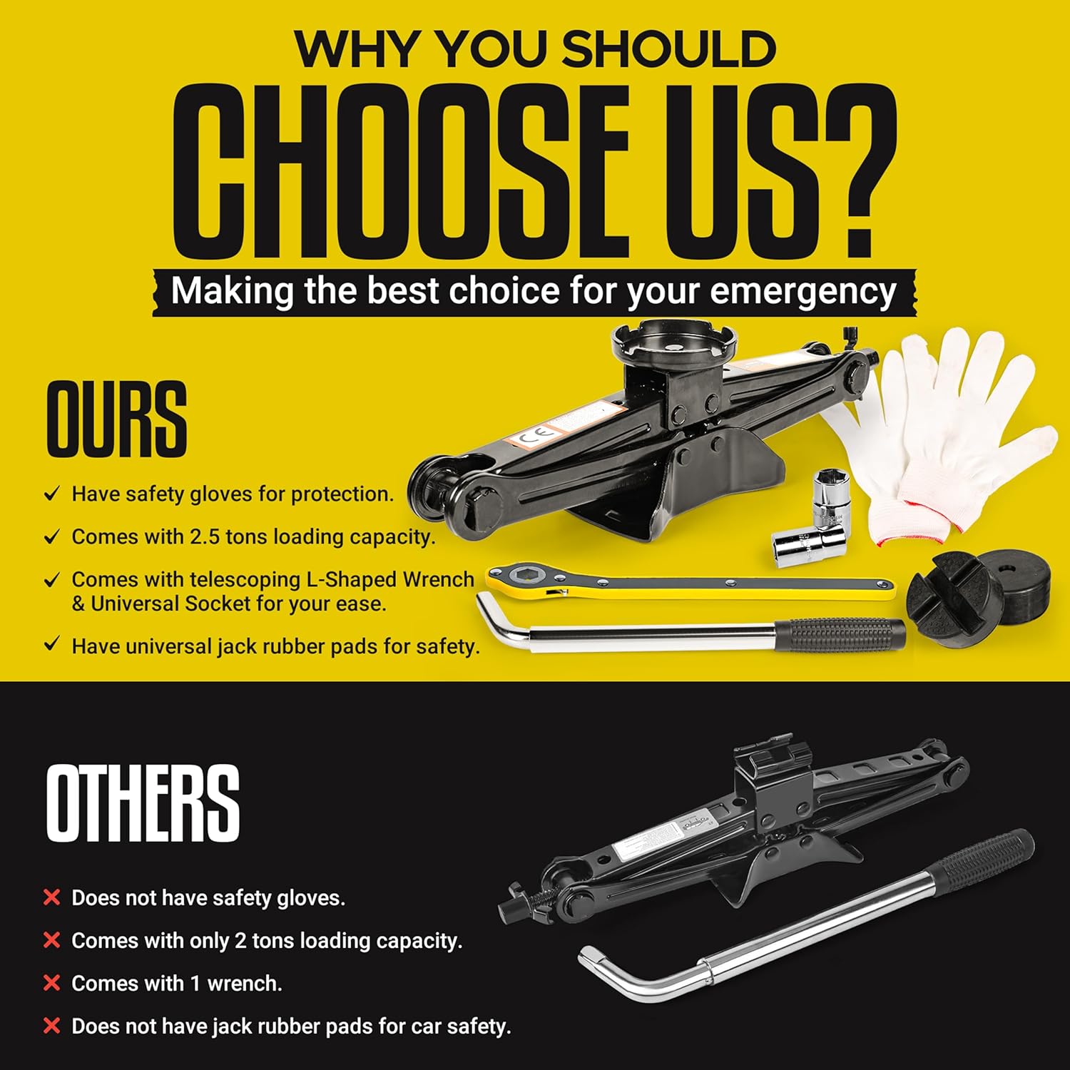 - (Scissor Jack Load Capacity) 2.5 Tons (5512 pounds) Jack is universal but optimal for smaller vehicles such as Sedans/Coupes (Package Contains) 1 Car Jack, 1 Rachet Wrench, 1 socket Wrench, 1 pair of gloves, 2 sockets, 1 bag (Stability and Reliability) This product is made with high qualilty materials designed to safely handle large loads. The item has an upgraded base to be more stable on the ground while in use. (Easy Usability) This item is intended to be for emergencies, hence its easy and simple design