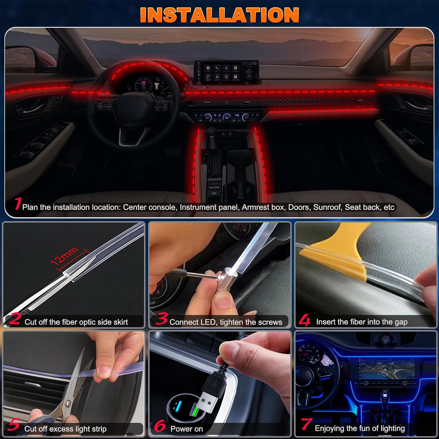 - Upgraded 3.0mm Fiber Optic: This interior car light uses exclusive high quality 3.0mm integrated molding fiber optic, which does not need to penetrate the fiber optic into the transparent tube. Upgraded to be brighter without bright spots and easier to install than traditional fiber optic lights from other's.