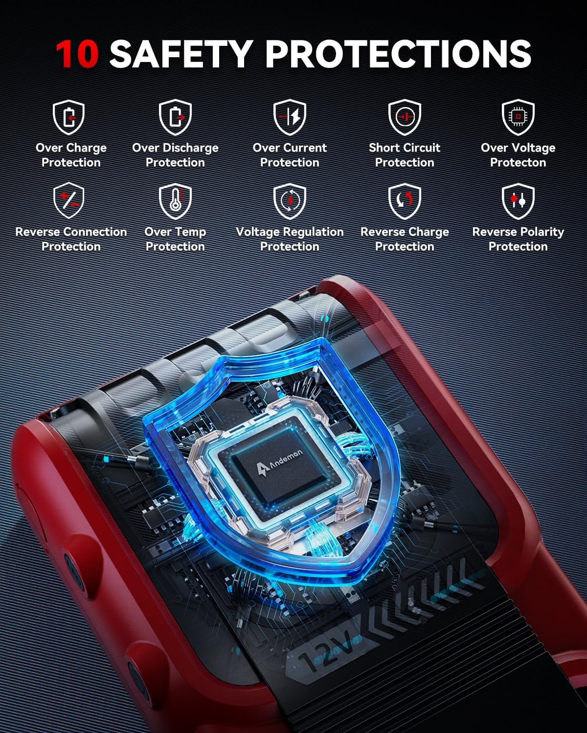 - ă10 SAFETY PROTECTIONSăWith UL Certification, this guarantees the device meets stringent safety standards.The intelligent safety terminals of this car starter feature 10 advanced Overload Protection,Sparks Protection,Reverse Charges Protection,Reverse Polarities Protection,Over Currents Protection,Low Temperature Protection,Over Charges Protection,Short Circuits Protection,Over Voltages Protection,High Temperatures Protection