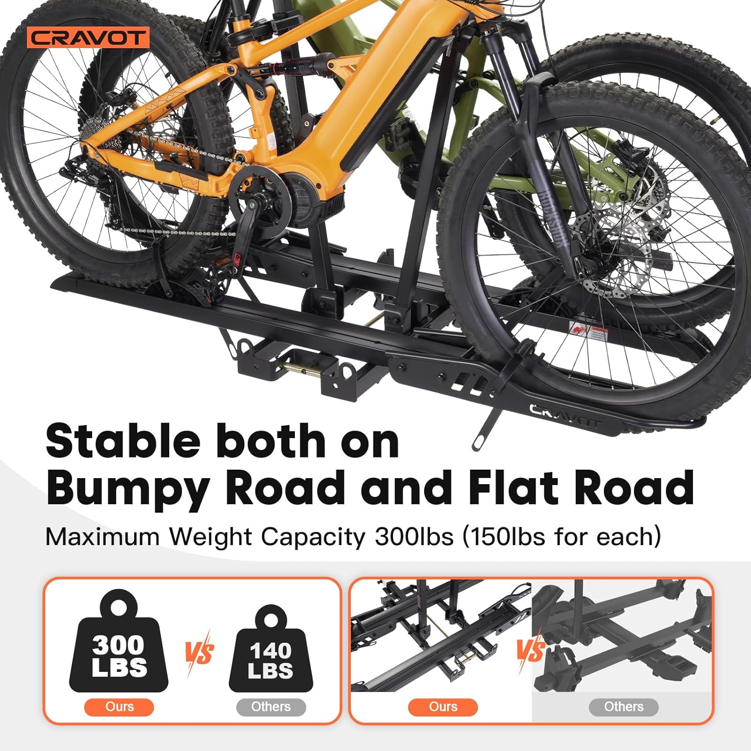 - 300lbs Capacity: CRAVOT heavy ebike rack with a ramp, is possible to hold up to 300lbs in total, or 150lbs per ebike or heavy bike. Fitting any vehicle equipped with a 2-inch receiver and accommodating ebikes up to 5'' wide and with a wheelbase up to 50''.