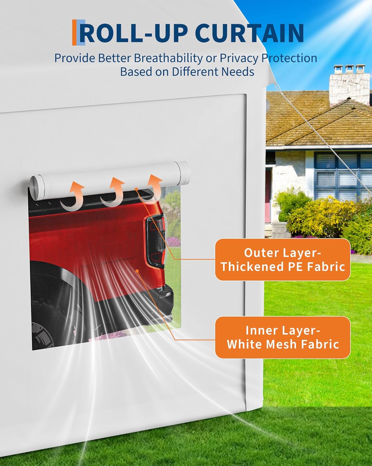- [Optimized Climate Control] Four zippered roll-up doors and four mesh ventilation windows allow 360° air circulation and prevent condensation build-up. Breathable car awnings are designed to protect the vehicle from temperature fluctuations while minimizing interior space - essential for preventing rust on classic cars or machinery. Removable side panels can be customized for the season.