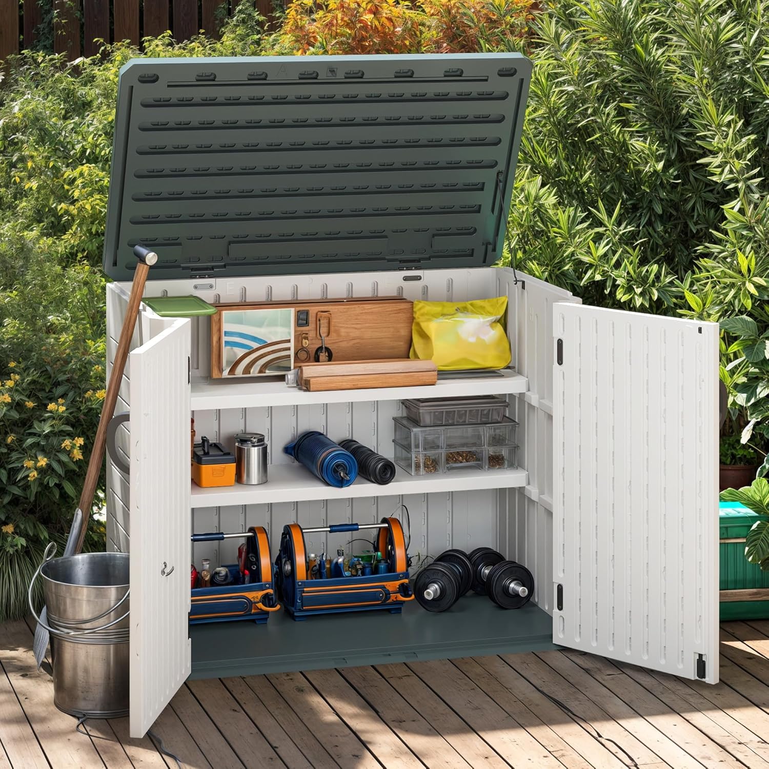 - Multi-Purpose Organization: The resin storage shed shelves feature a weight capacity of 44 pounds, making them ideal for storing gardening tools, camping gear, and household essentials for an uncluttered space