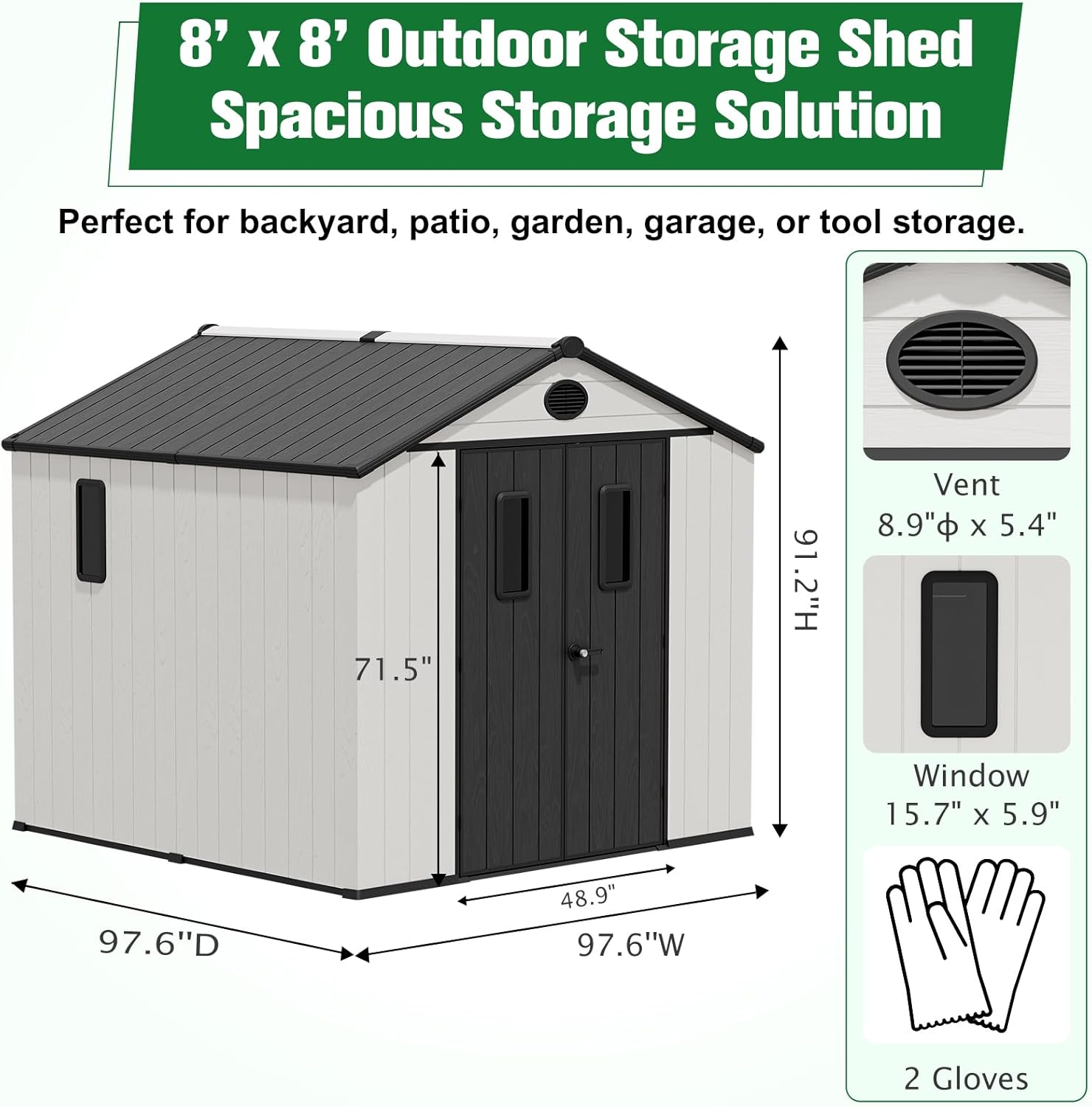 - SPACIOUS 8x8 SHED: Designed for maximum organization, this backyard shed offers ample space to store bikes, lawnmowers, gardening tools, and power tools. Built-in roof hooks allow vertical storage for lightweight gear; 97.6''W x 97.6''D x 91.2''H