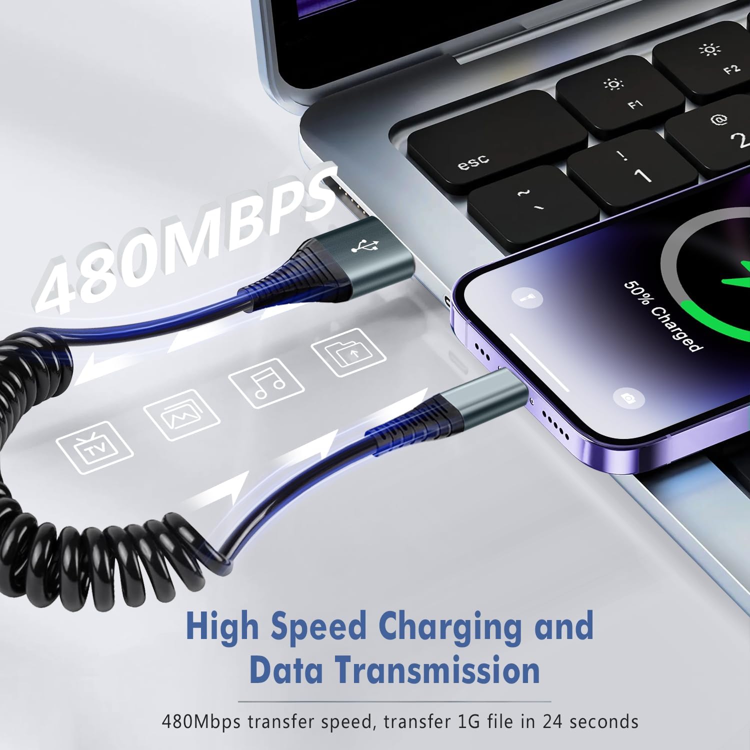 - 【Coiled Lightning Cable】A retractable iPhone car charger designed with high-elasticity TPU material and a spring structure (tested for 20,000+ stretch cycles). The short iPhone charger cord features a flexible coil that resists deformation, smoothly extends from 1.15ft to 6ft, and saves space while preventing tangles, with its Lightning connector remaining securely attached even on bumpy roads.