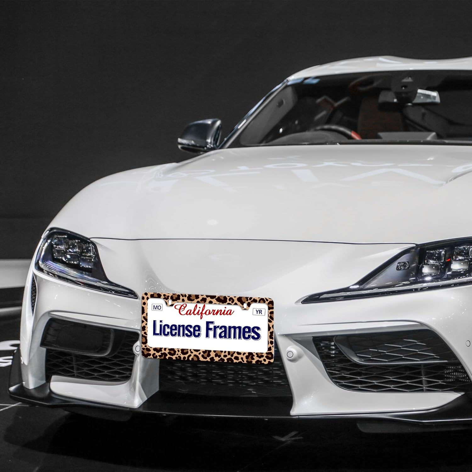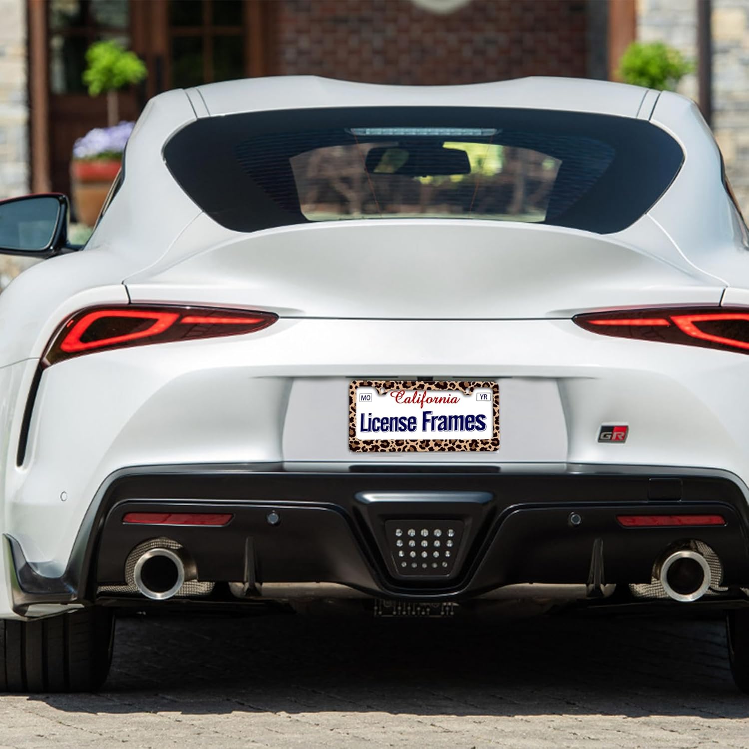 - Standard Size:This 2-hole leopard license plate frame measures 12.3"X 6.3"to fit all standard size U.S.license plates and protects the front and rear panels of the vehicle.The narrow border of the license plate frame does not obscure the status label or cover the state name of the license plate.