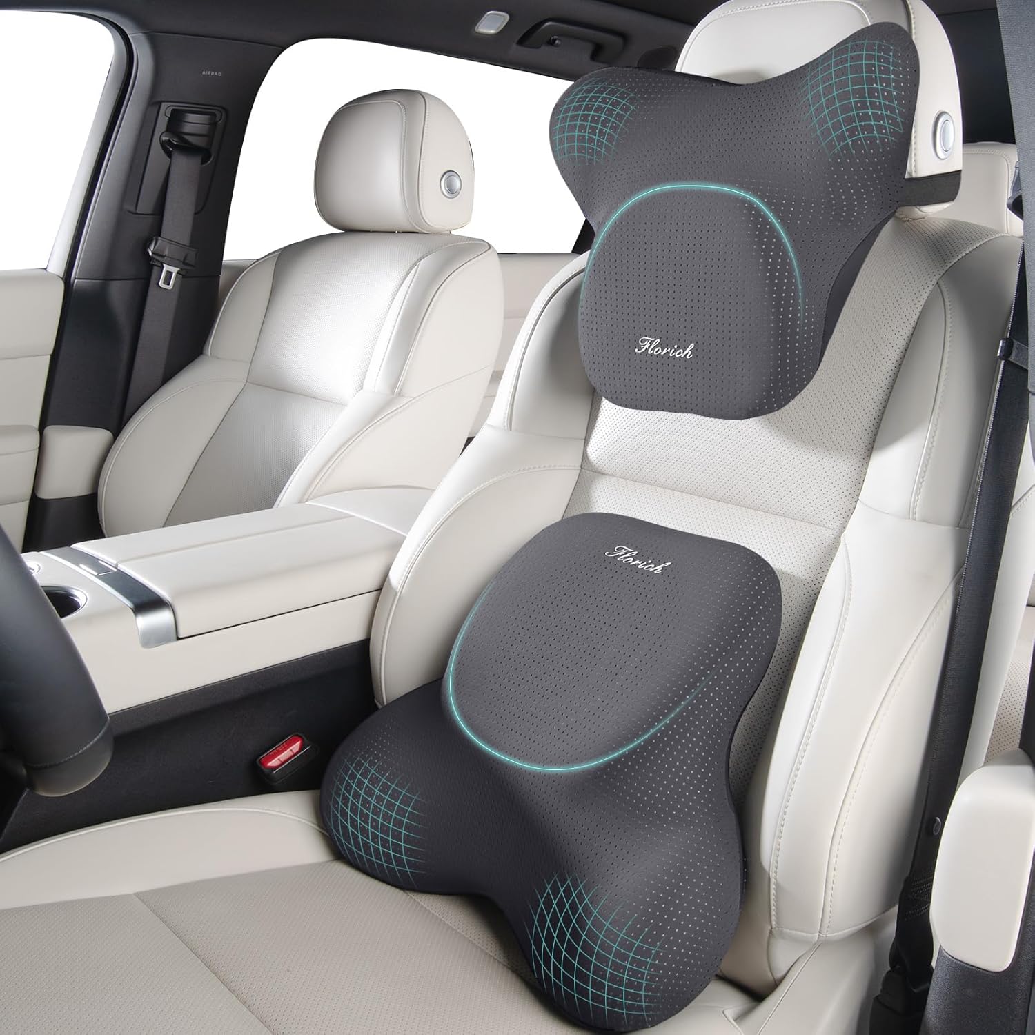 FLORICH Car Lumbar Support Pillow and Neck Headrest Pillow for Office Chair, Ergonomic Memory Foam, Relieves Neck, Back Pain, Pressure-Relieving Back Support for Car, Office Chair & Wheelchair – Gray