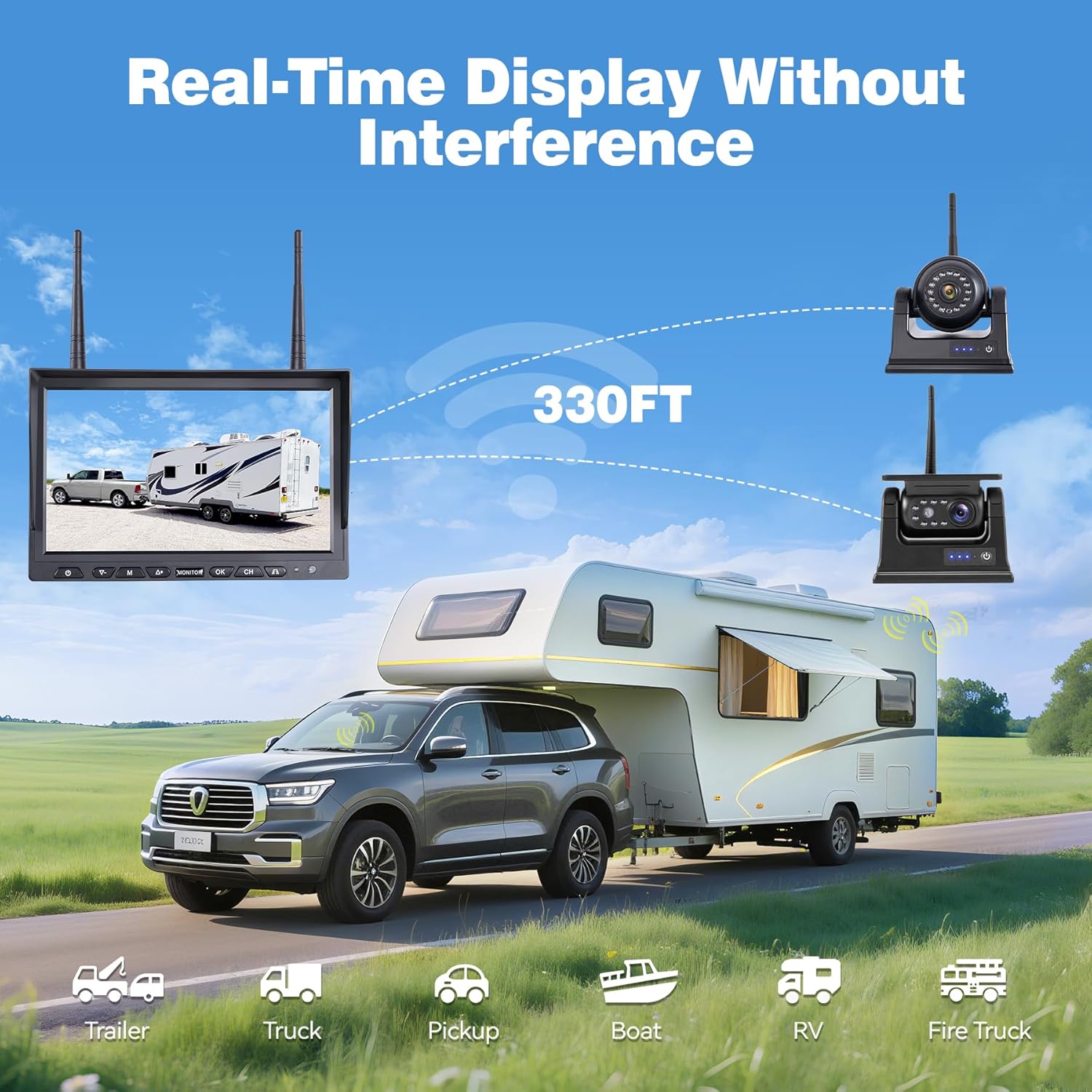 - 【Ultra-Reliable 2.4GHz Wireless Technology】 Enjoy seamless live monitoring with our professional-grade 2.4GHz dual-antenna system, guaranteeing zero-lag video transmission. With exceptional 330-foot open-area range and highway-speed (102 mph) stability, it's engineered for everything from compact cars to heavy-duty vehicles - including trucks, RVs, trailers and marine vessels.