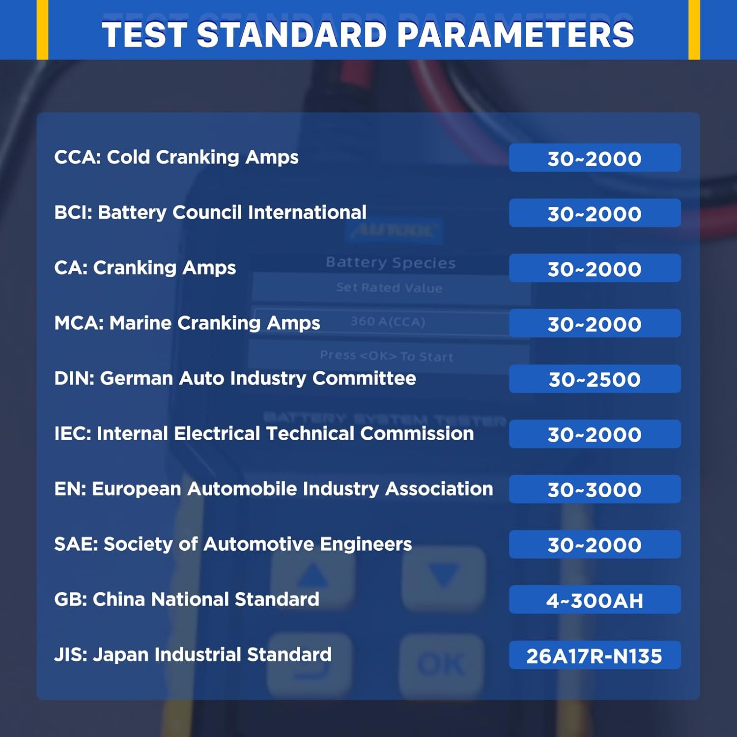 - 【Safety Performance】The car battery tester features misconnection protection and is equipped with insulated test clips, ensuring that even if the positive and negative terminals are connected incorrectly, neither the tester nor the battery will be damaged. 12V battery tester includes various common battery models and specifications, allowing for comparison and analysis of actual test results against standard values to accurately assess battery issues.