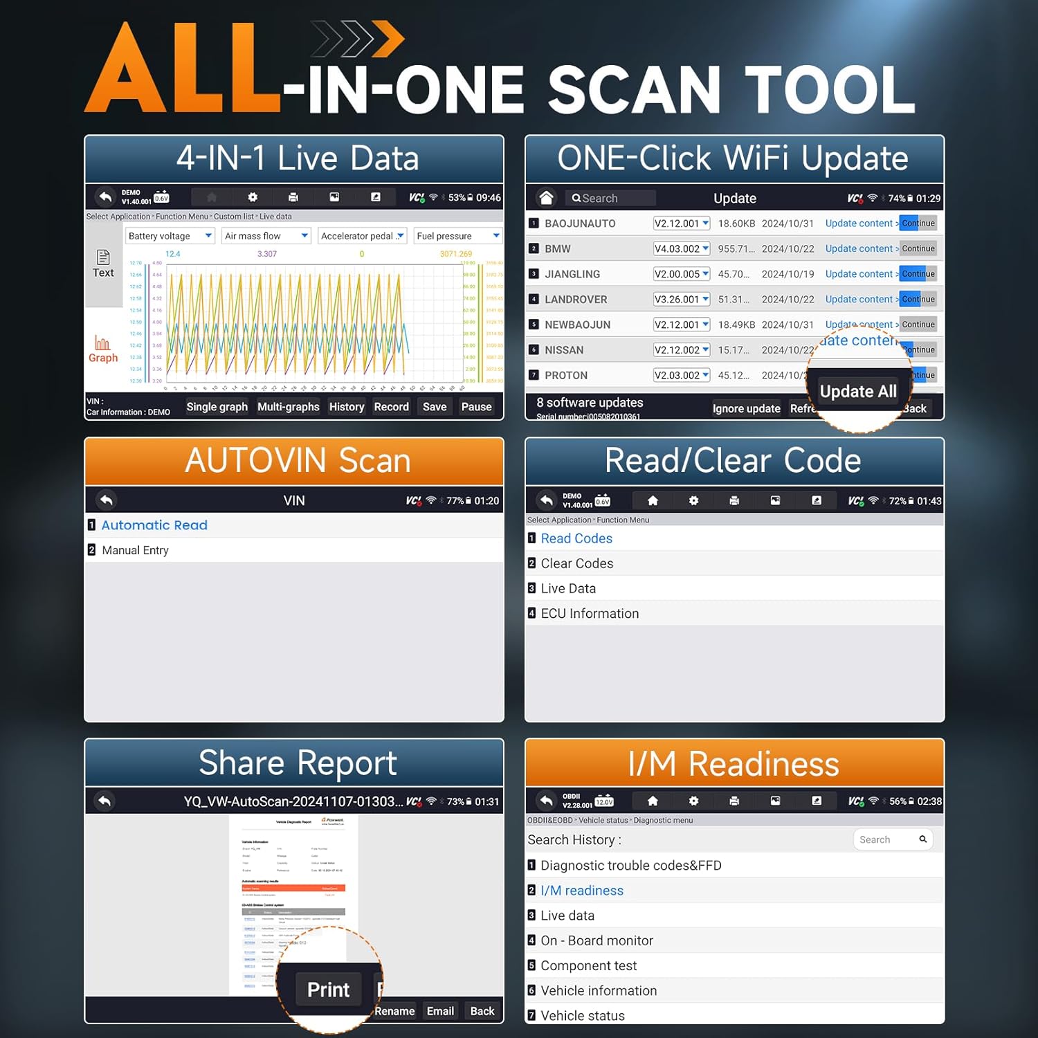 - Professional Bidirectional Control Tests - Perform true bidirectional scan tool on essential modules including ABS, SRS (Airbag), Transmission, and Powertrain (Engine) systems. Command actuators like fuel pumps, cooling fans, and fuel injectors directly through the code scanner to validate system functionality—no teardown required. Perfect for professional technicians and advanced DIYers who want to pinpoint faults quickly, eliminate guesswork, and avoid unnecessary repair costs. 👉Note: Initial software update is required before using Active Test.