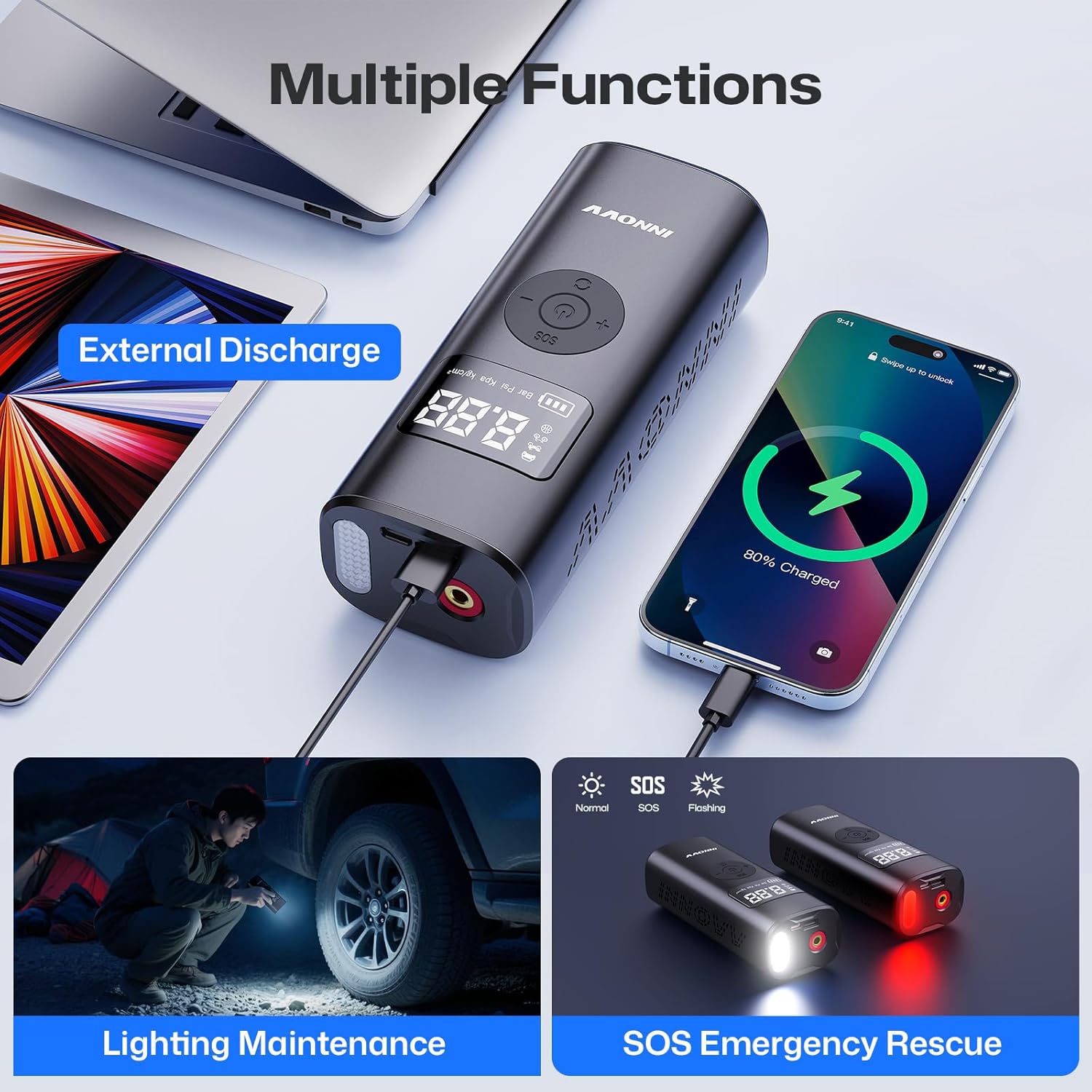 - 【Multi-Functional Emergency Tool】INNOVV inflatable tyre pump can not only inflate your tyres, but also comes with 2 LED light modes on the top (white & red light) to illuminate and facilitate inflation in dark environments, and it can also be used as an emergency light in case of emergency. In addition, the portable air compressor is equipped with Type-c and USB input/output ports to provide backup power for your mobile phone and other electronic devices.