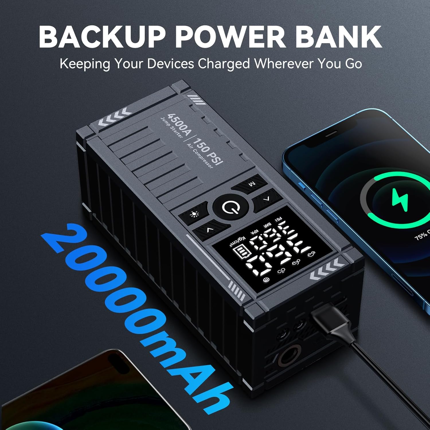 - All-in-One Car Jumper Starter: More than just a jump starter, it functions as a tire inflator, high-capacity power bank, LED flashlight, and SOS emergency beacon. Equipped with USB-C fast charging and USB-A output, it charges smartphones, tablets, and other gadgets, making it the perfect all-in-one tool for road trips, outdoor adventures, and emergencies