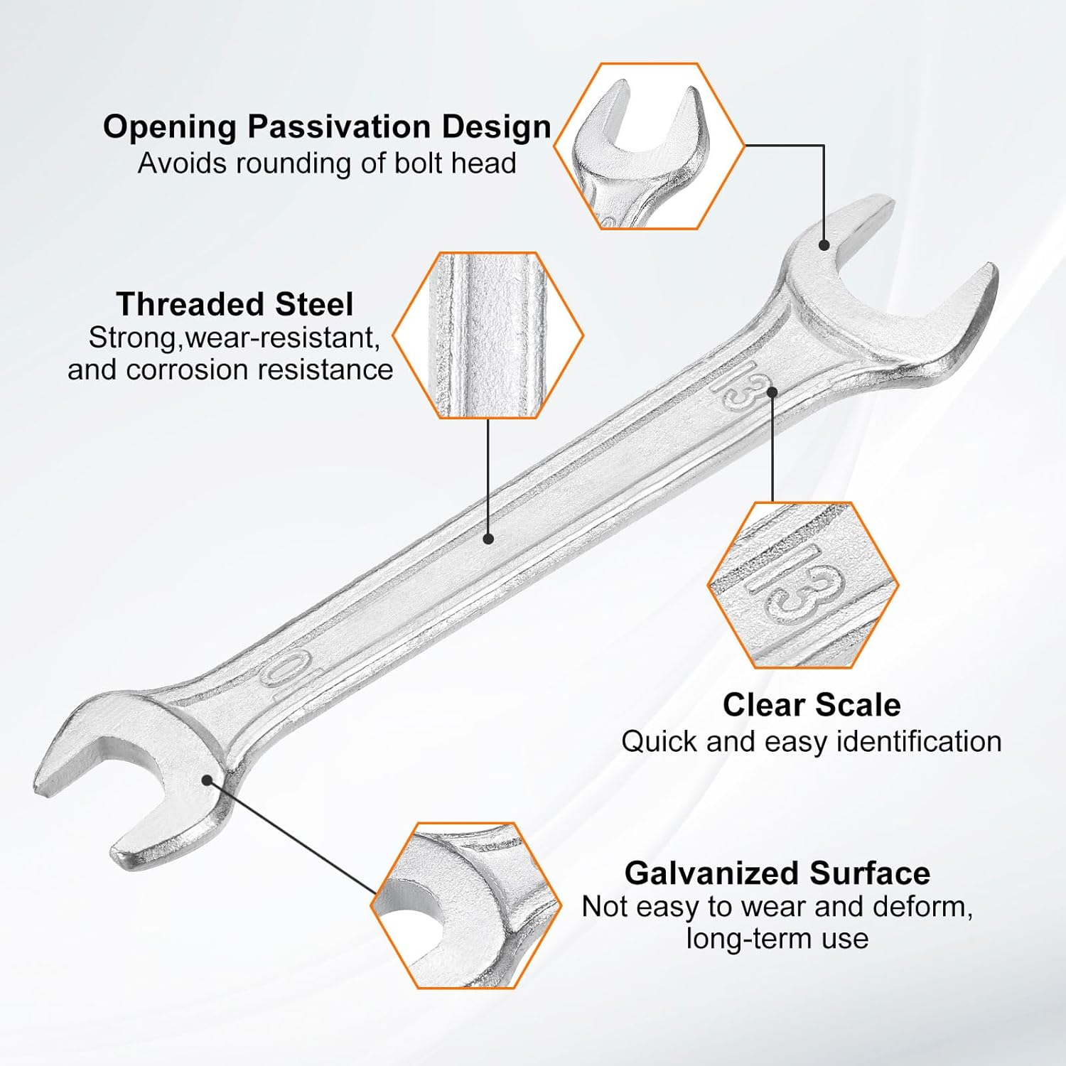 - Material - Our double open-end wrench is made of threaded steel with high hardness and excellent wear resistance. The surface galvanizing improves its wear resistance, keeps its surface smooth and reduces wear, is not easy to deform, and can be used for a long time.