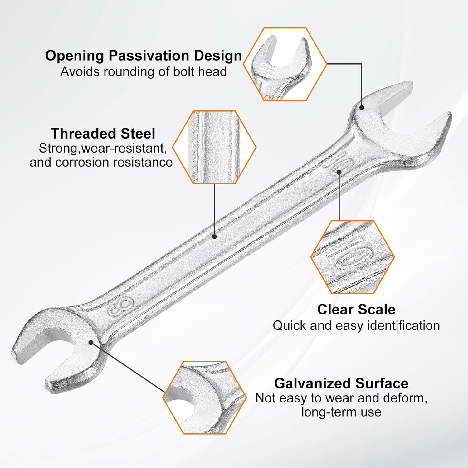 - Size - Metric Open End Size: 8mm x 10mm; Total Length: 110mm / 4.33"; Handle Width: 11mm / 0.43". Handle Thick: 4mm / 0.16". Size stamped on both ends of the handle for quick identification
