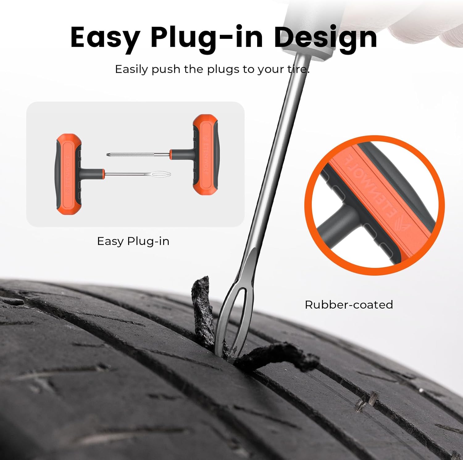 - DURABLE AND COMFORTABLE: The T-handle tools in the tire plug kit are made of stainless steel, allowing you to easily repair most tires on the market. Featuring ergonomic, rubber-coated handles, they provide greater torque and make it easier to apply force while reducing hand fatigue