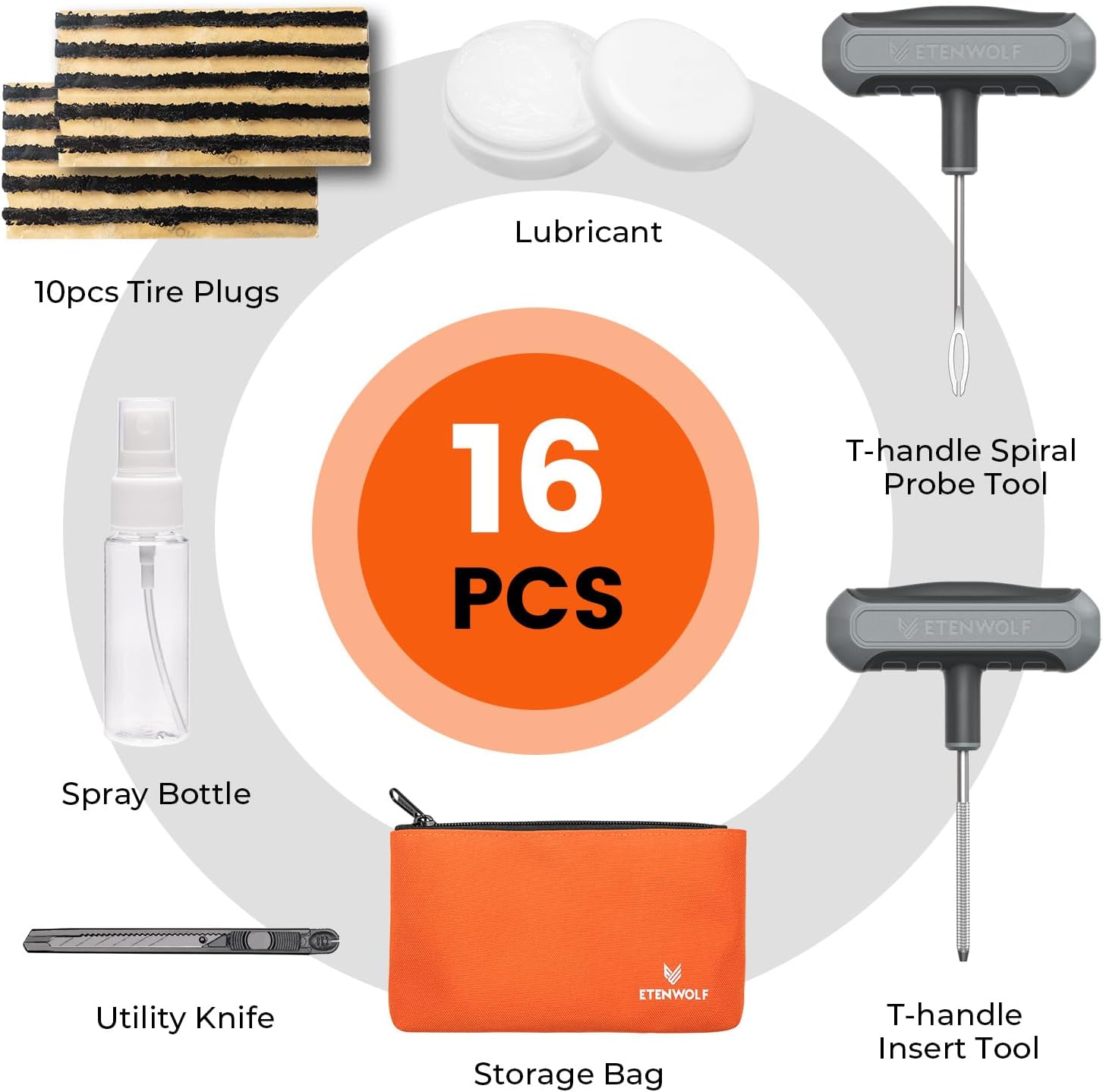 - WHAT'S INCLUDED: T-handle Insert Tool×1, T-handle Spiral Probe Tool×1, Lubricant×1, Utility Knife×1, 5pcs 0.14in Tire Plugs×1, 5pcs 0.18in Tire Plugs×1, Empty Spray Bottle×1, Storage Bag×1