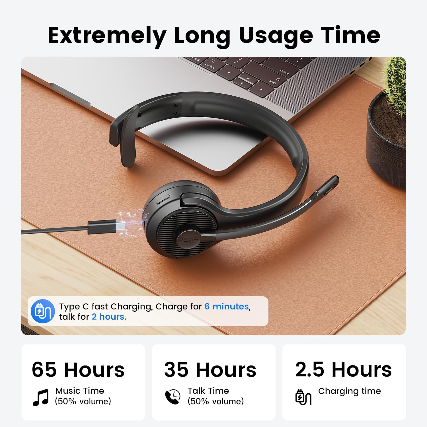 - Up to 65 Hours Battery: Designed for long shifts and extended use, this wireless headset with microphone offers up to 65 hours of music playback and 35 hours of talk time. A dependable companion for all-day productivity or long-distance driving.