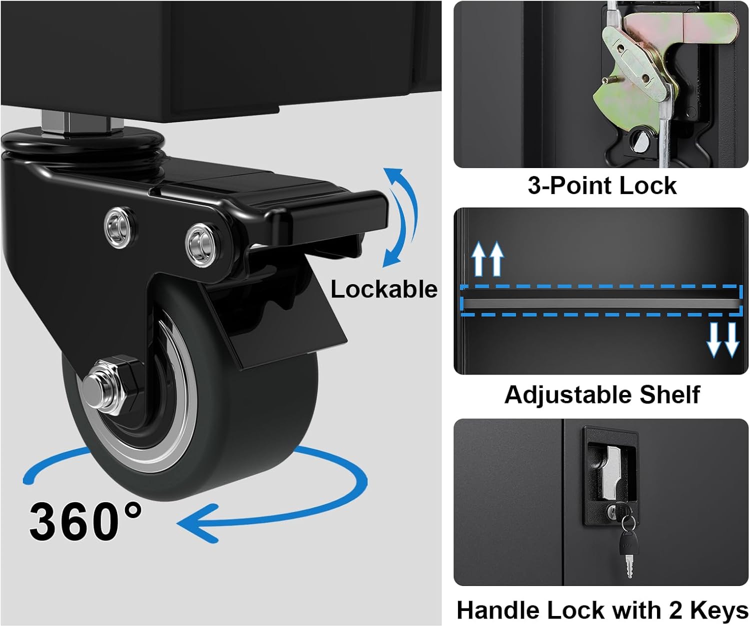 - 【Thoughtful Design Details】Adjustable shelves allow you to customize storage space to meet your needs. Garage storage cabinet with lock, equipped with a three-point locking system and two keys, ensuring safety by preventing accidental access by children or pets.