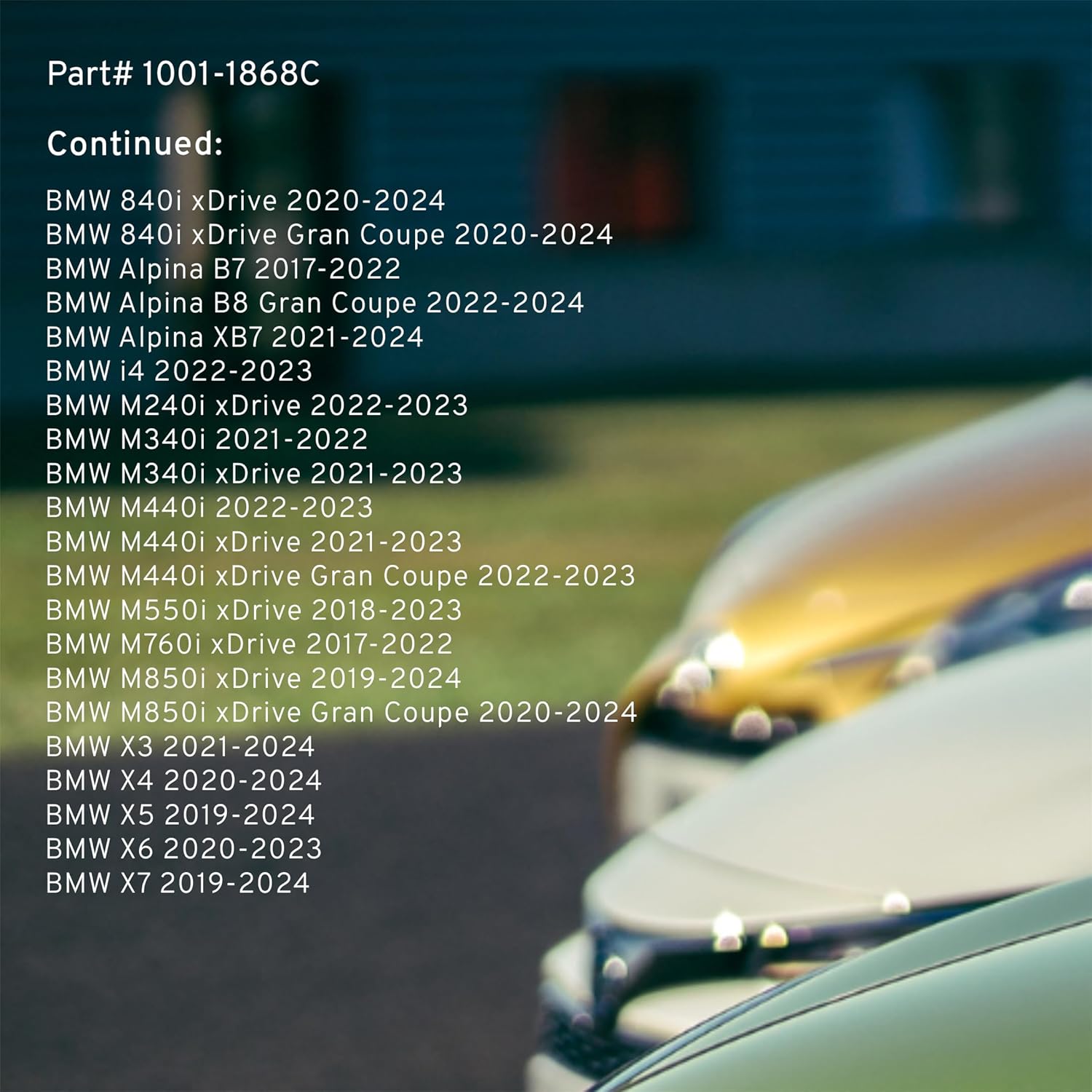 - FITMENT LIST: Select Models 2016-2024 BMW (1001-1868C) Verify Fitment using AmazonConfirmedFit tool.