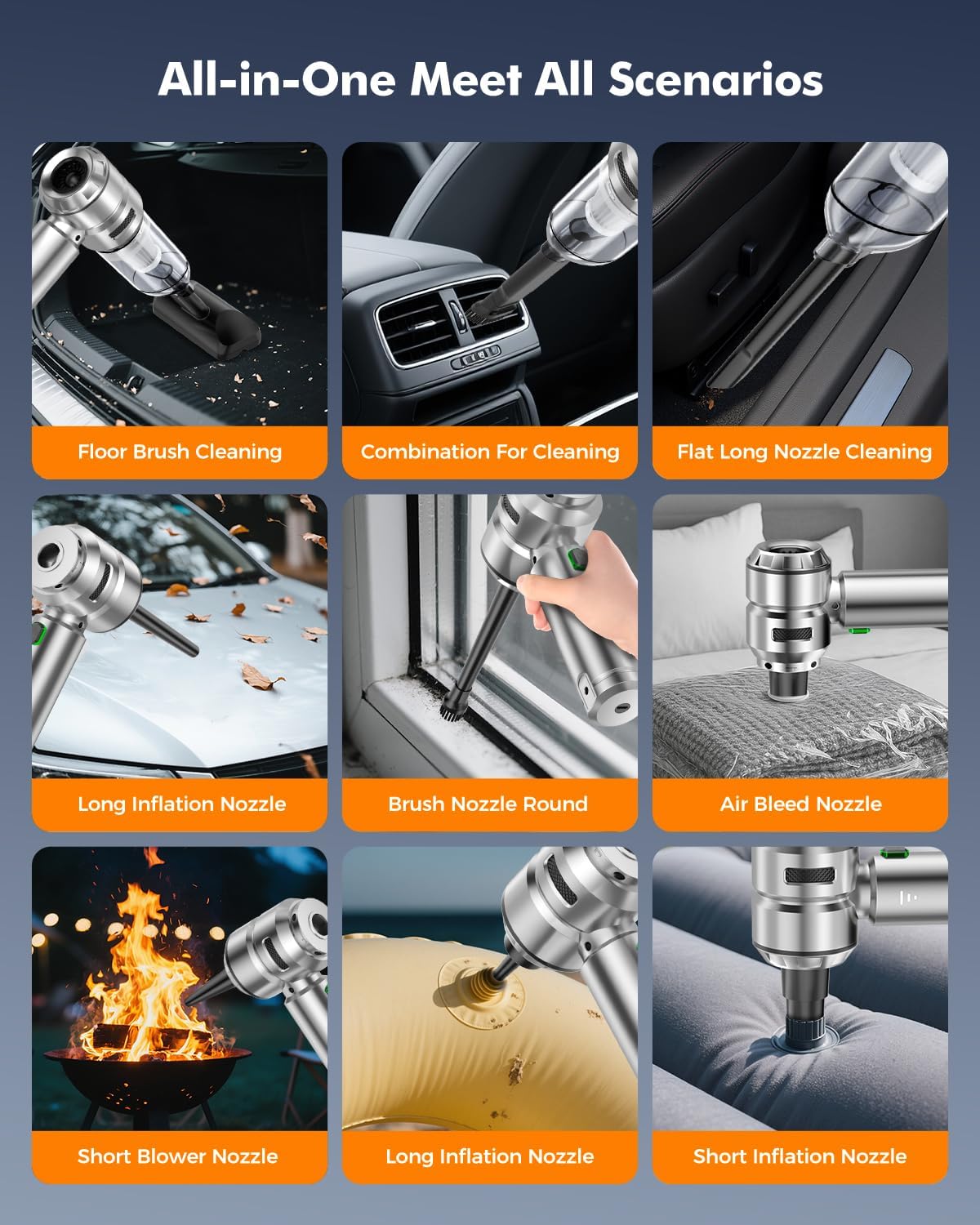 - ă4-in-1 Multi-functionăVNOST S7 Pro wireless handheld car vacuum cleaner strong suction is equipped with nine nozzle attachments that combine vacuuming, blowing, inflating and extracting functions. Whether you need to clean your car's interior, inflate your swim ring, or perform vacuuming to extract air, this car vaccum will meet your needs.