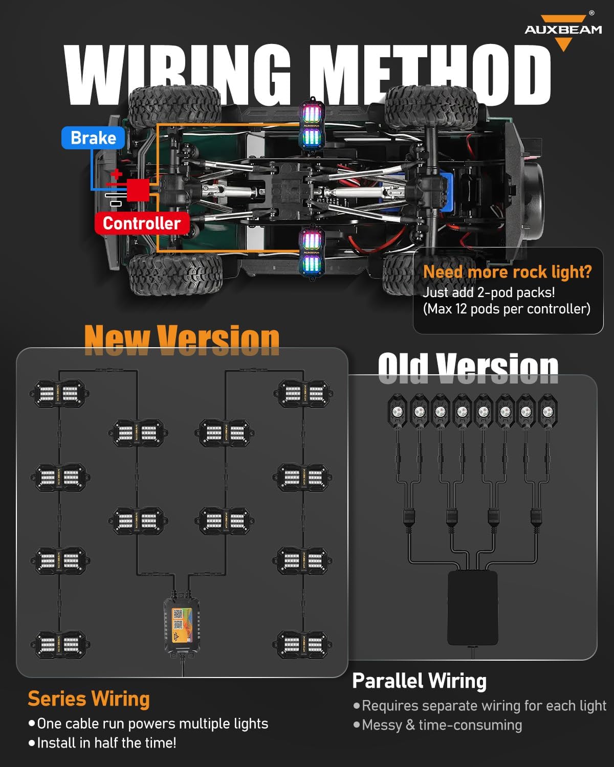 - 【NOTE: Only 2-pod rock lights included. NO CONTROLLER】 Expands ONLY on identical Auxbeam rock light models