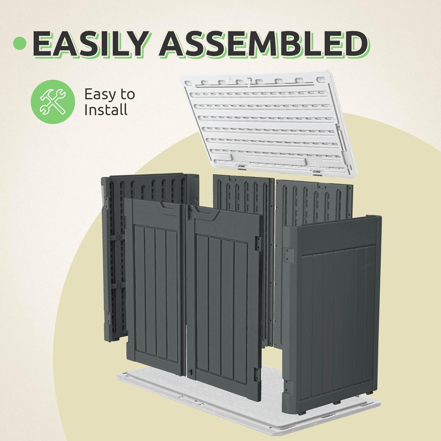 - Quick Setup and Separate Shipment: Measuring 53.2''L x 33.2''W x 46.3''H exterior, and 50.8''L x 29.9''W x 44.5''H interior, this resin plastic shed comes with clear instructions for a 20-minute easy assembly