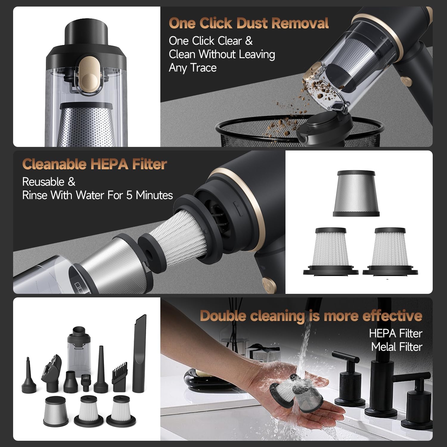 Car Vacuum Portable Cordless, Hand Vacuum with 16000PA High Power, 7 in 1 Mini Car Vacuum Cleaner with One-Click Empty, Dual Hepa Filter, LED Light, Type-C Charging Small Handheld Vac